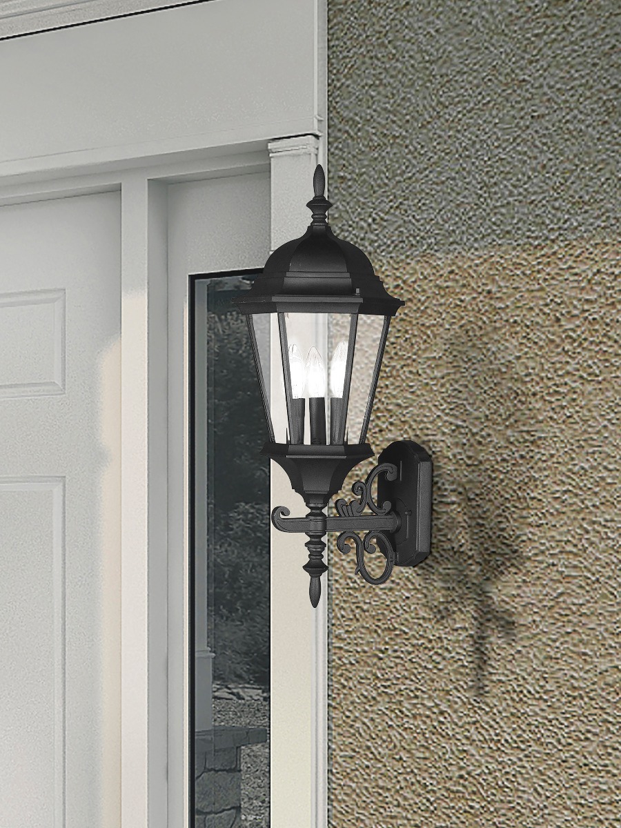 A decorative top and arm are paired with a simple six-sided frame in this black and clear beveled glass outdoor wall lantern. constructed of cast aluminum, this durable exterior fixture looks even better with a nostalgic style edison bulb illuminating its elegant silhouette.