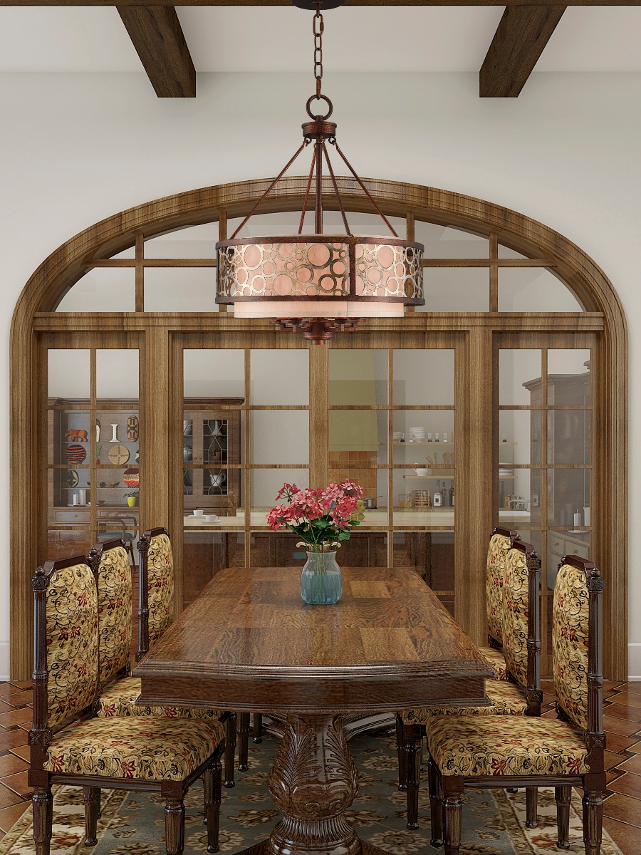 Distinct and stylish, this pendant light is great for foyers, dining areas and living rooms. Finished in palacial bronze with gilded accents, this design features decorative circles over a warm, silk champagne handmade hardback shade.