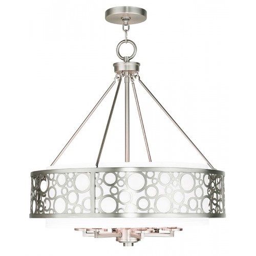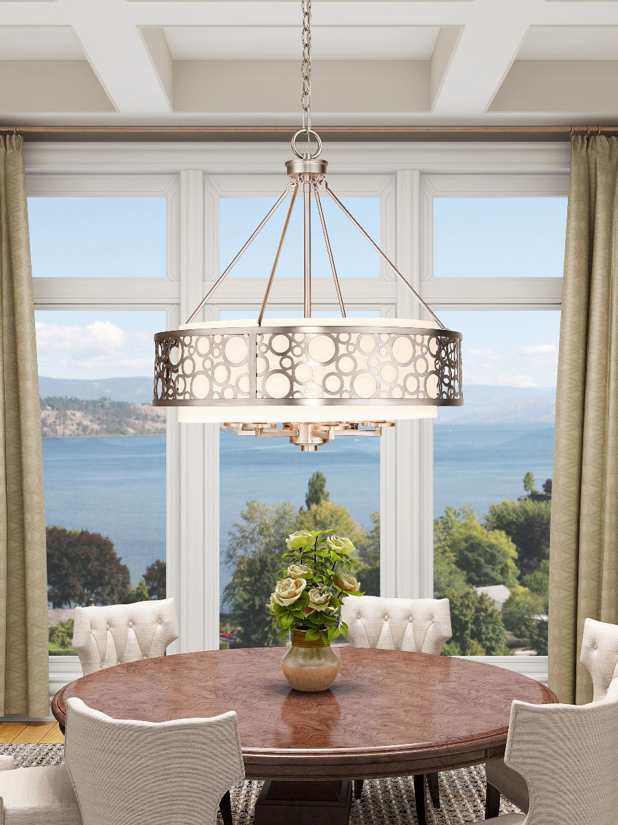 Distinct and stylish, this pendant light is great for foyers, dining areas and living rooms. Finished in brushed nickel, this design features decorative circles over a hand crafted white fabric hardback shade.