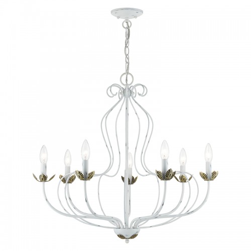 The seven-light Katarina floral chandelier showcases a graceful look. The antique white finish combined with antique brass finish accents completes this timeless and casual design.