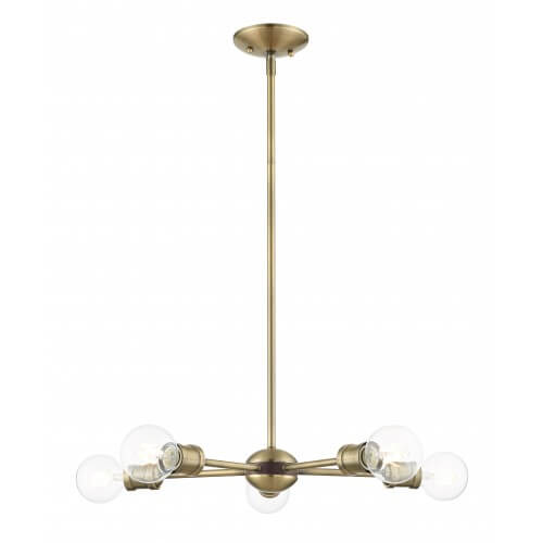 Simplicity and attention to detail are the key elements of the Lansdale collection. The dimensional form, exposed bulbs and combination of finishes adds a playful mood to a contemporary or urban interior. This five-light chandelier design gives a new face to a dining area or kitchen. It is shown in an antique brass finish.