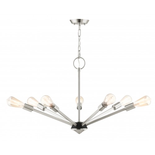 Add eye-catching lighting to your home decorating with the lively look of the Prague chandelier in brushed nickel with bronze accents chandelier. The seven light design features vintage style Edison bulbs that up the style factor, giving it an attractive, mid-century modern and industrial edge.