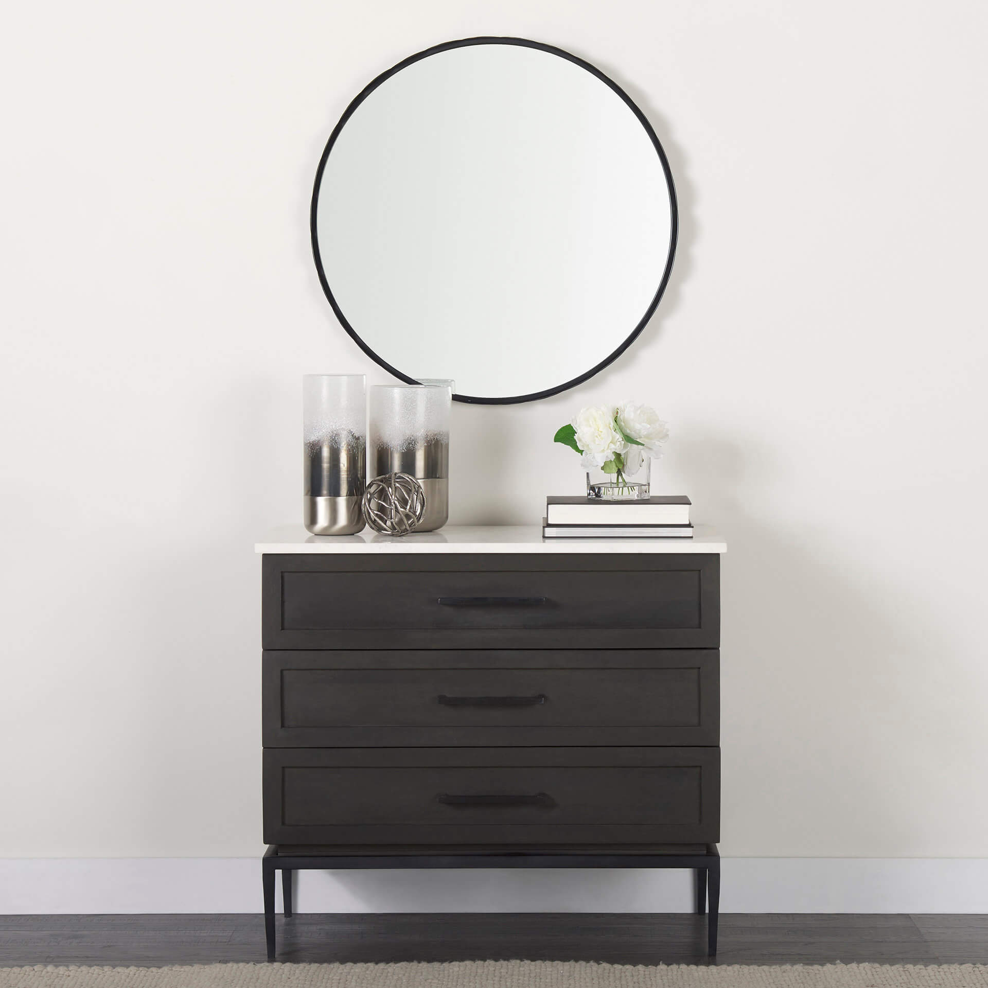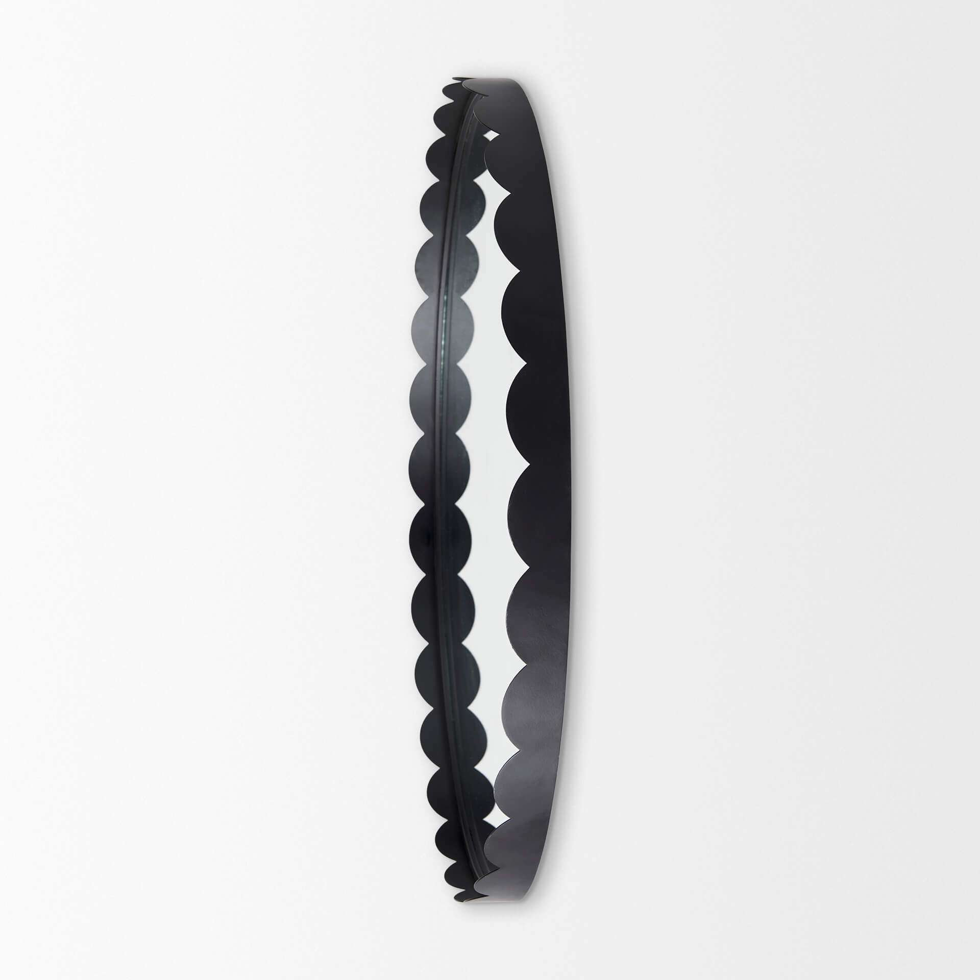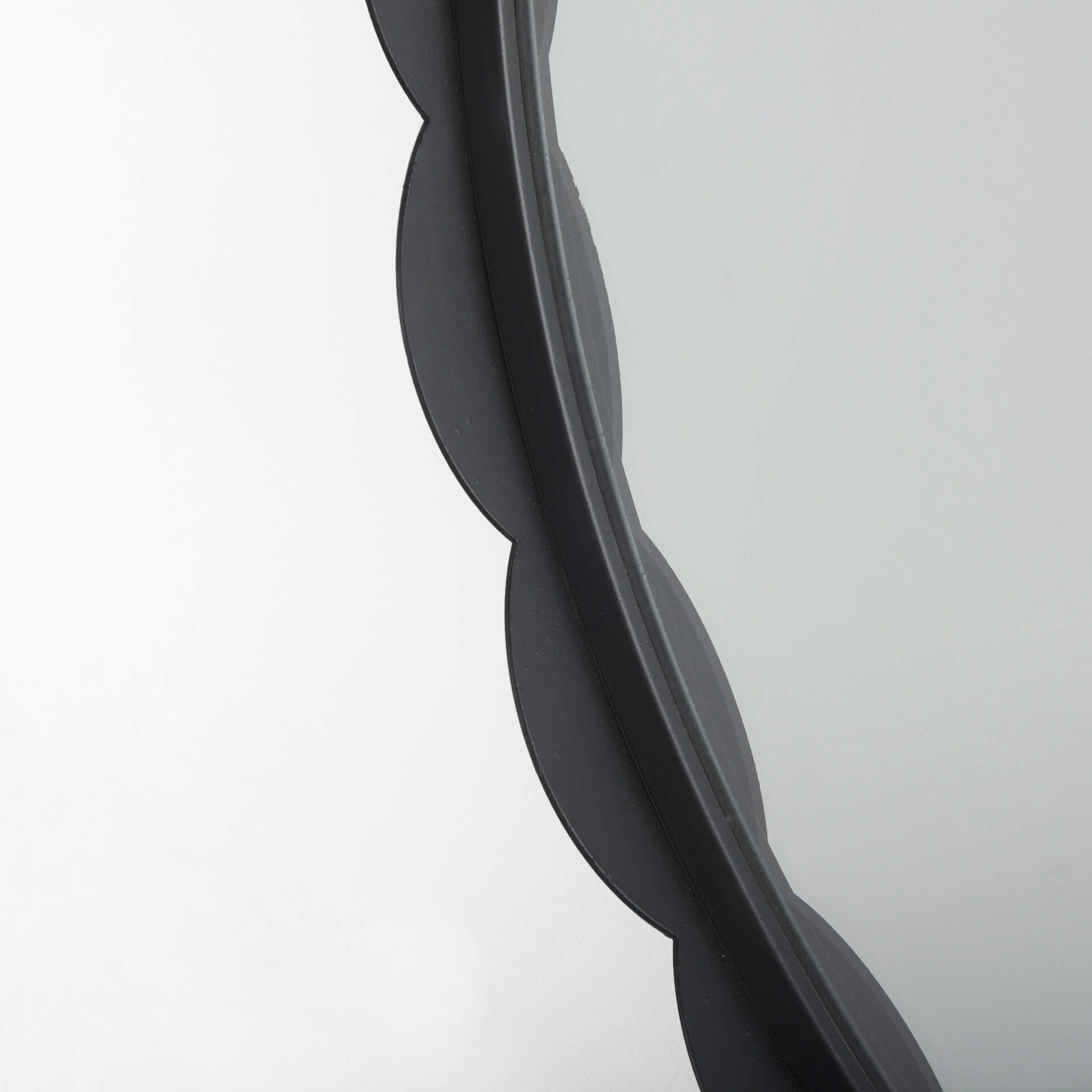• Metal and Mirror Construction  A matte-black finish adds a strong, modern look to this mirror’s slender, scallop-edged, iron frame.