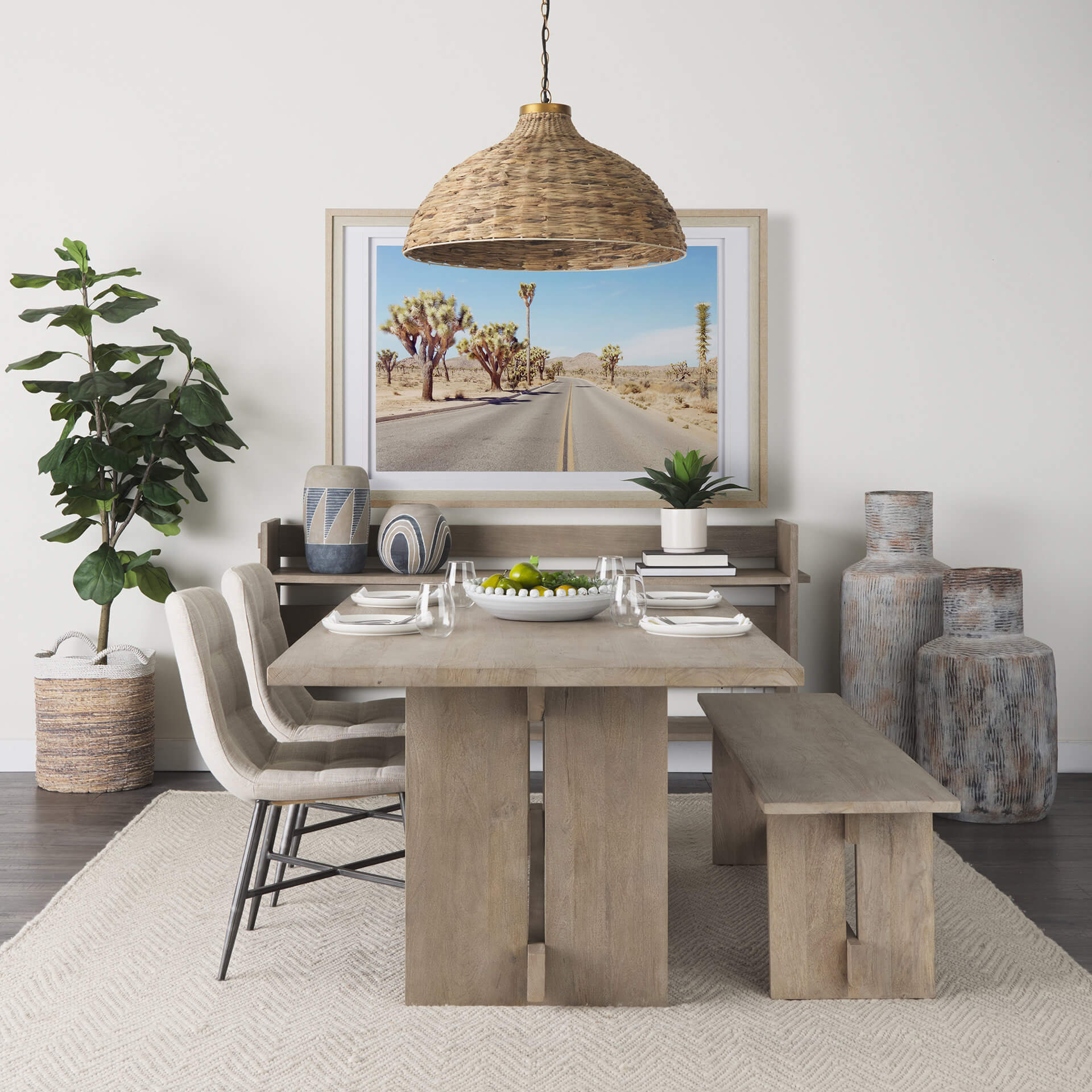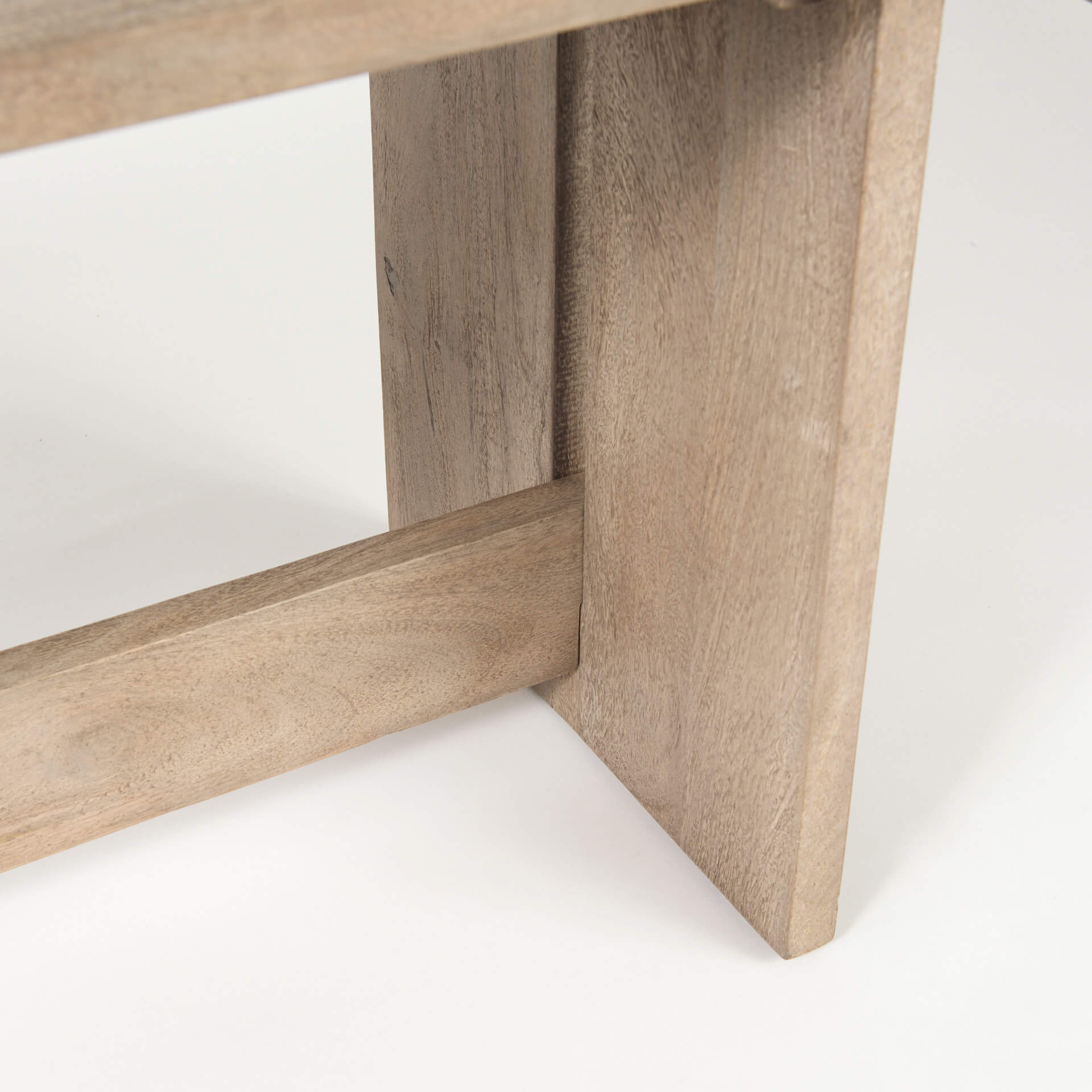 The Aida Collection is a contemporary transitional addition to any living space. The Aida Dining Bench is crafted of durable Indian mango wood, finished in a light gray tone and fine sandblasted to feature a subtle texture. The wide plank bench seat is supported by four solid wood, wide legs, with one long beam across the bottom that protrudes through each side that make this piece unique and sturdy.