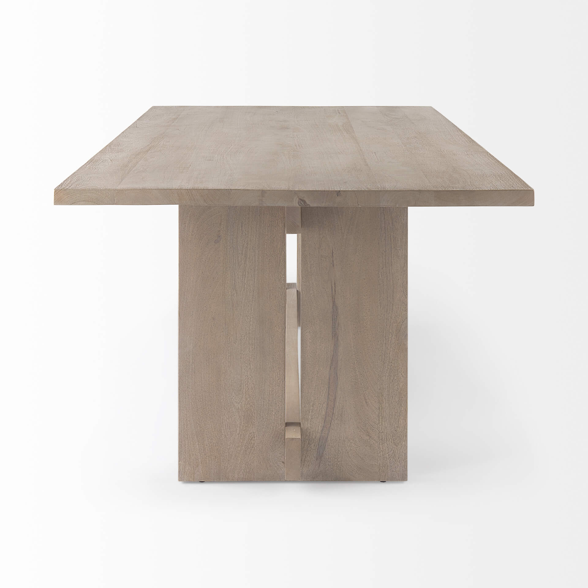 The Aida Collection is a contemporary transitional addition to any living space. This classic rectangular shape dining table is crafted of durable Indian mango wood, finished in a cool light gray tone and fine sandblasted to feature subtle texture. The wide plank tabletop is supported by four solid wood, plank-like legs with one long beam running through the bottom for ample support.