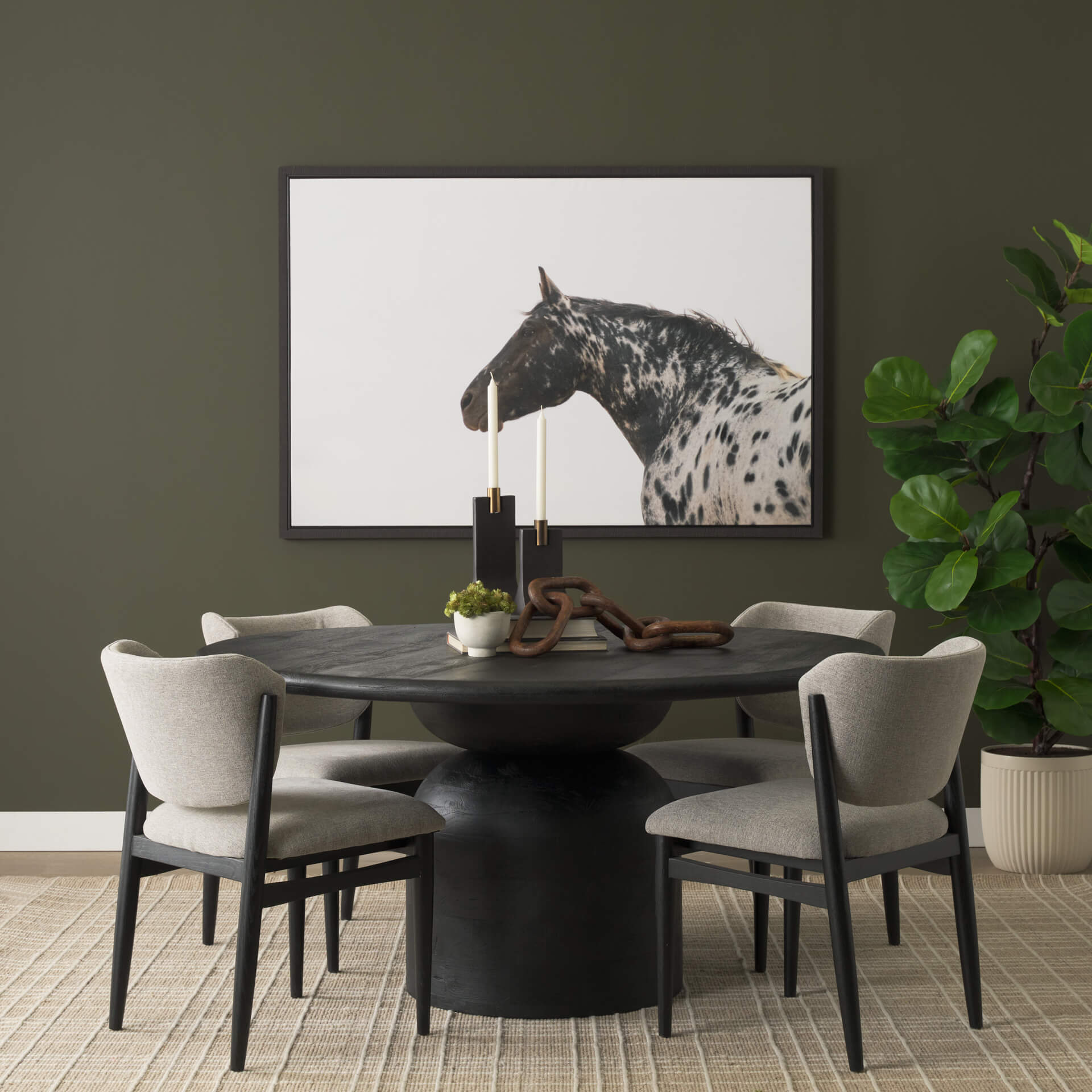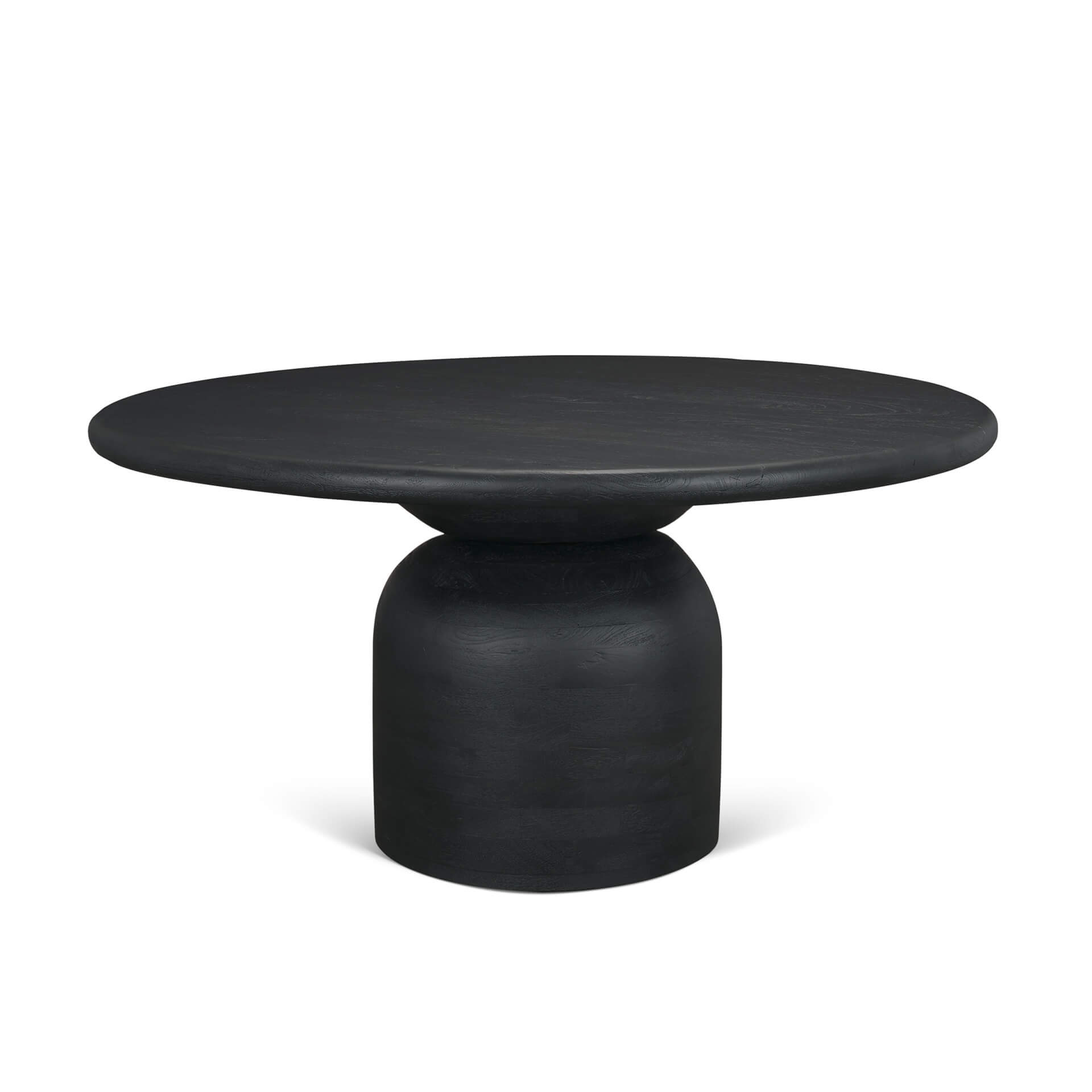 The Atlas dining table makes a bold, contemporary statement with its solid mango wood top finished in a deep matte black. Its round silhouette sits atop a stacked geometric pedestal, where a subtly rounded brick-lay pattern adds sculptural texture to the dark, refined surface. The interplay between shadow and geometric clean curves gives the table a dramatic yet understated presence. Sophisticated and modern, Atlas in black becomes an anchor point in the dining room giving a striking, architectural, and effortlessly elevated aesthetic.