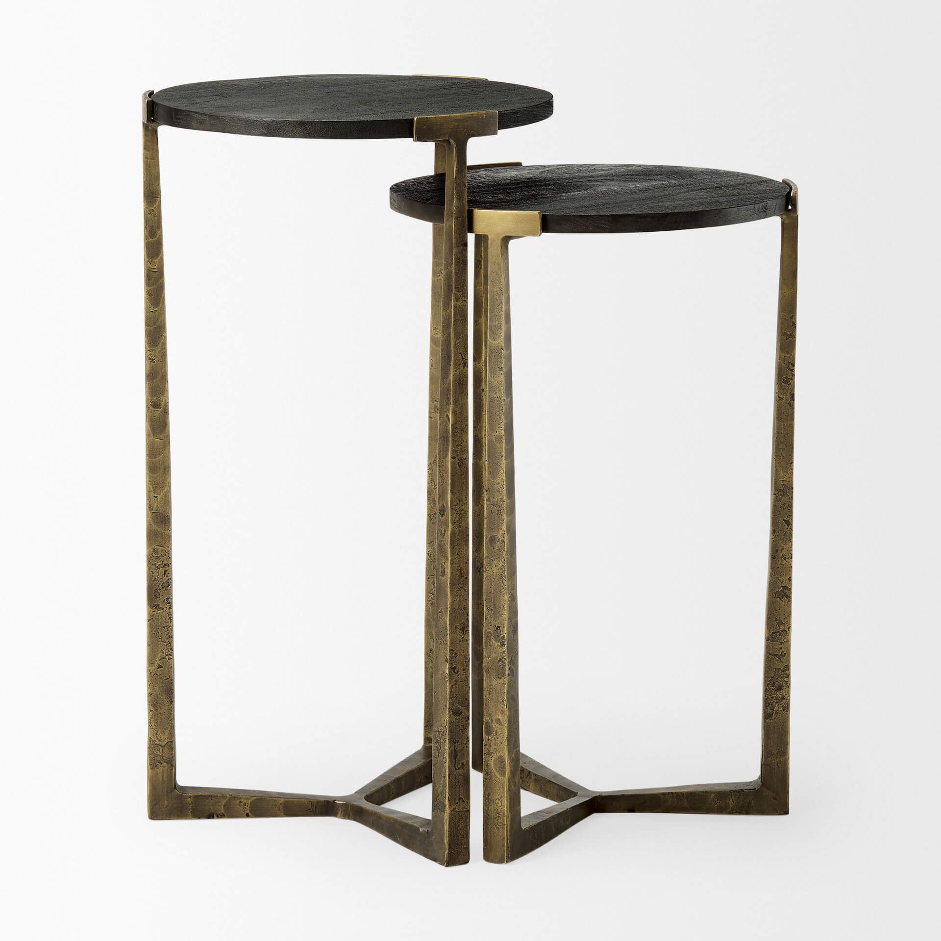 The set of two nesting Atticus Side Tables with rich black solid wood tabletops are set in a sturdy, hammered iron metal frame that has been beautifully finished in an antique gold to reflect the texture of the iron. The contrasting finishes of these side tables add a dramatic flair to modern contemporary spaces.