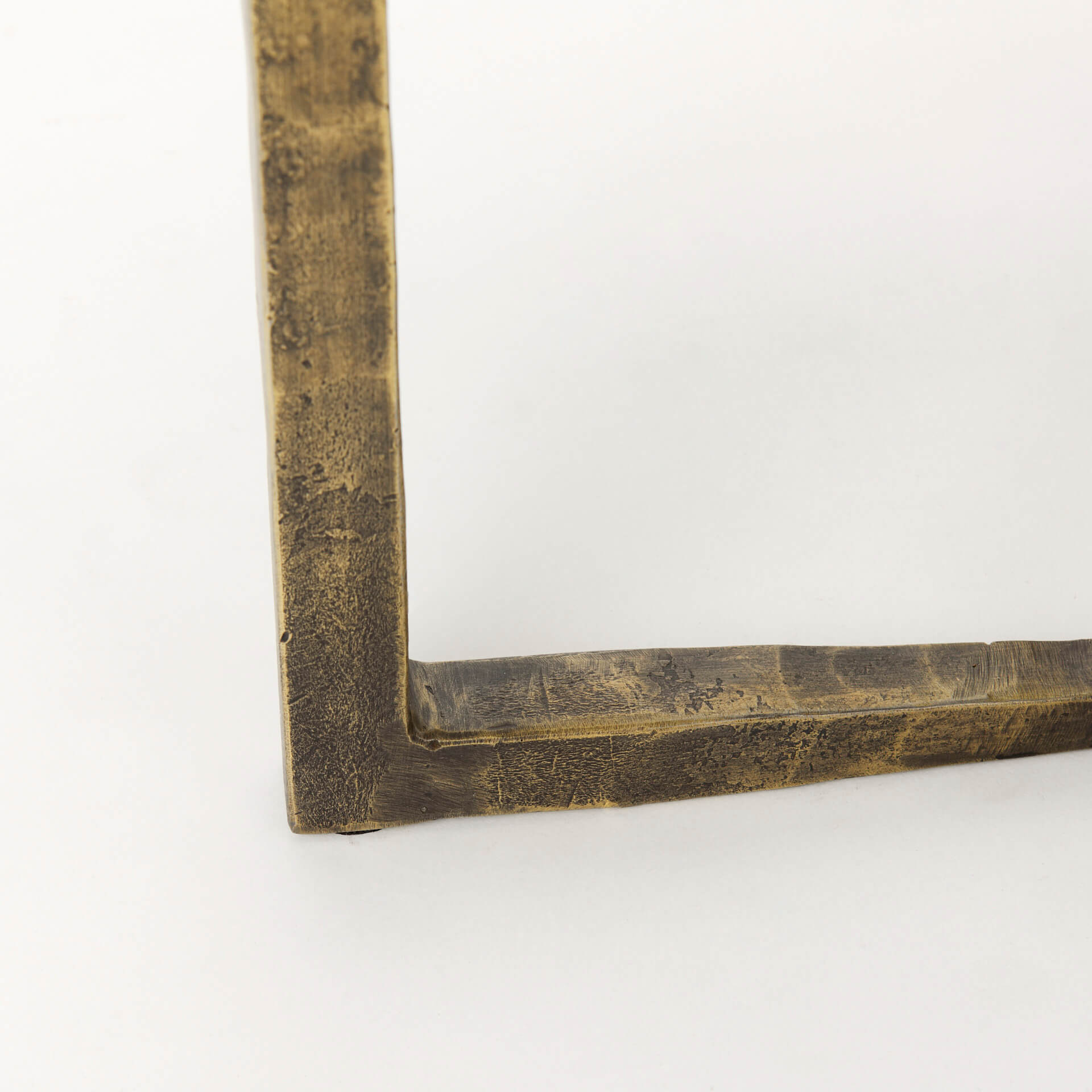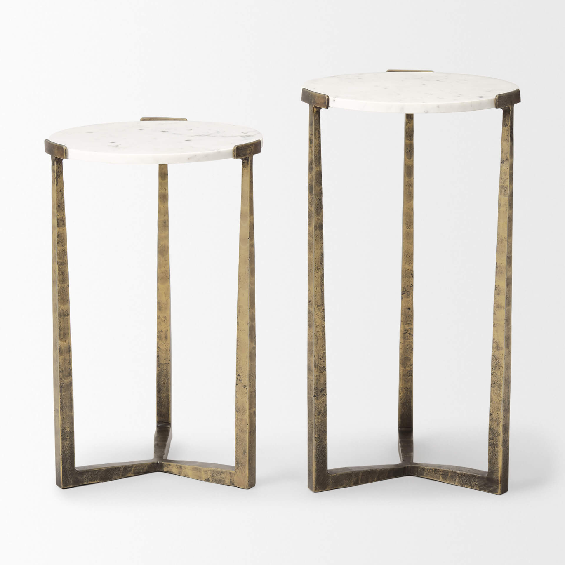 The Atticus Side Tables (sold in a set of 2) tastefully features solid white marble* tabletops that are secured onto a hammered iron metal, cross-leg frame with an antique gold finish. The elegant pairing of the white marble tops with the strong, textured iron frame in a gold finish adds an organic modern touch to contemporary spaces.