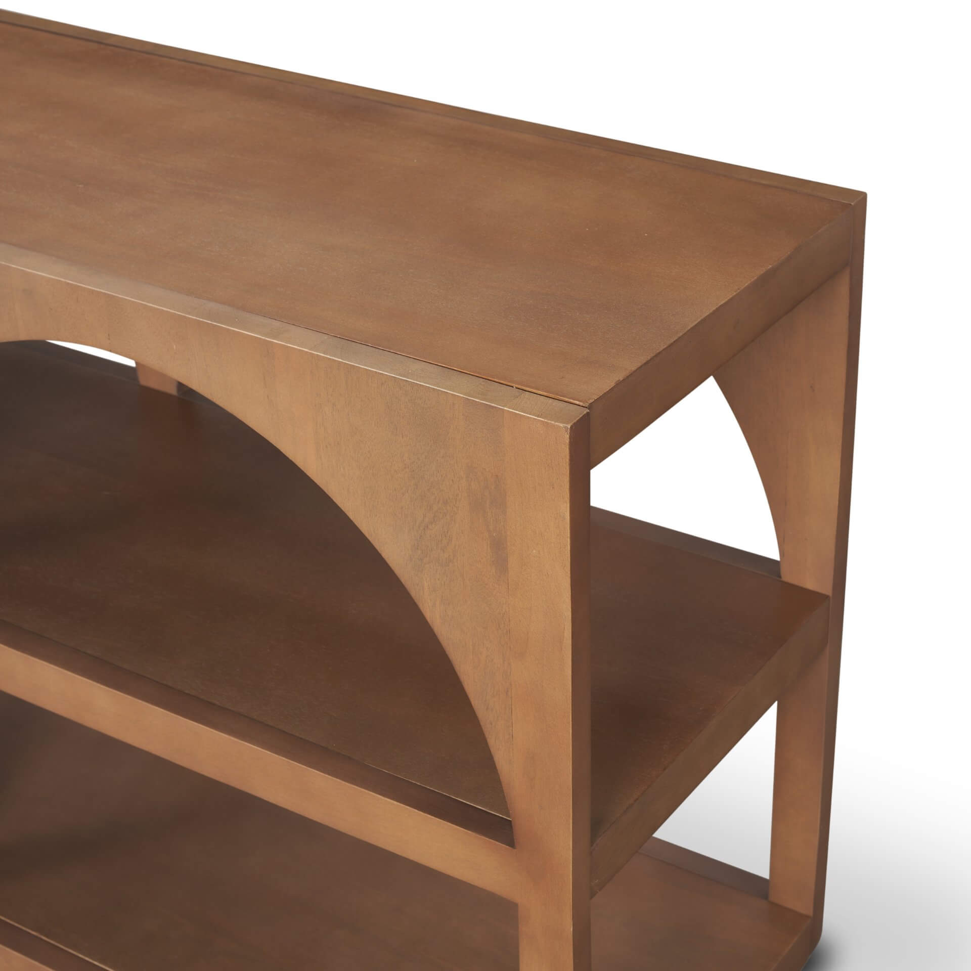 Bela Large Console Table features a unique design with two graceful three-arched frames, adding an artistic flair to your living space. Crafted from premium mango wood, its smooth, medium brown finish radiates warmth and sophistication, creating an inviting atmosphere. With two spacious shelves, this unit offers both practical storage and a platform to showcase your cherished decor pieces, books, and more. Elevate your interior with the perfect blend of style and functionality with our arched frame open console table. Part of the Bela Collection.
