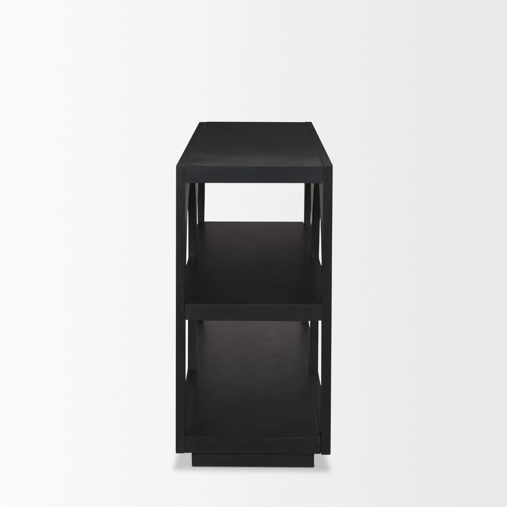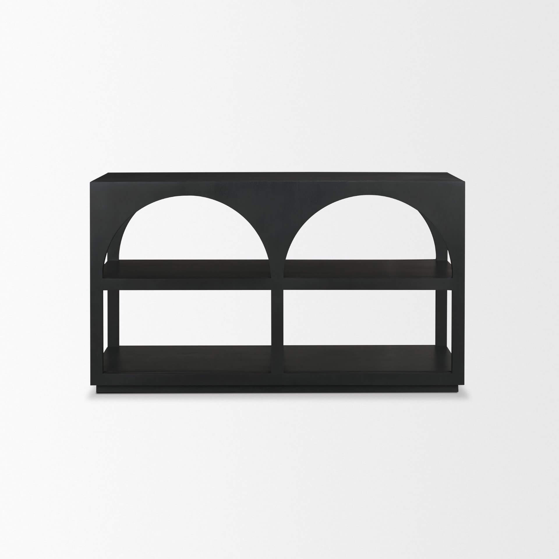 Bela Small Console Table features a unique design with two graceful double-arched frames, adding an artistic flair to your living space. Crafted from premium mango wood, its smooth, matte black finish radiates warmth and sophistication, creating an inviting atmosphere. With two spacious shelves, this unit offers both practical storage and a platform to showcase your cherished decor pieces, books, and more. Elevate your interior with the perfect blend of style and functionality with our arched frame open console table. Part of the Bela Collection.