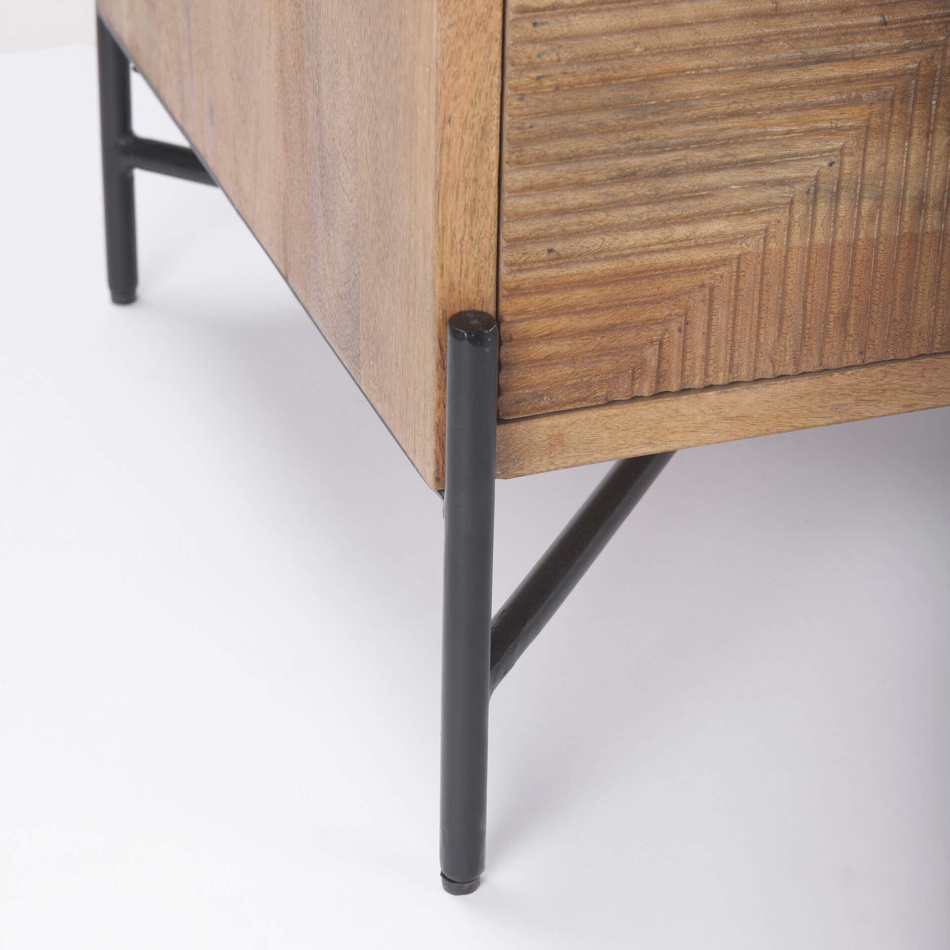 Made from solid wood set on elegant iron legs, the Cairo Accent Cabinet is the perfect contemporary cabinet to introduce into a tropical or lakeside aesthetic. This light brown cabinet has been crafted from quality mango wood and is perched atop a sturdy, matte black iron frame. The two drawers feature a linear motif with a horizontal and triangle pattern. The roomy drawers are ideal for secreting away essentials.