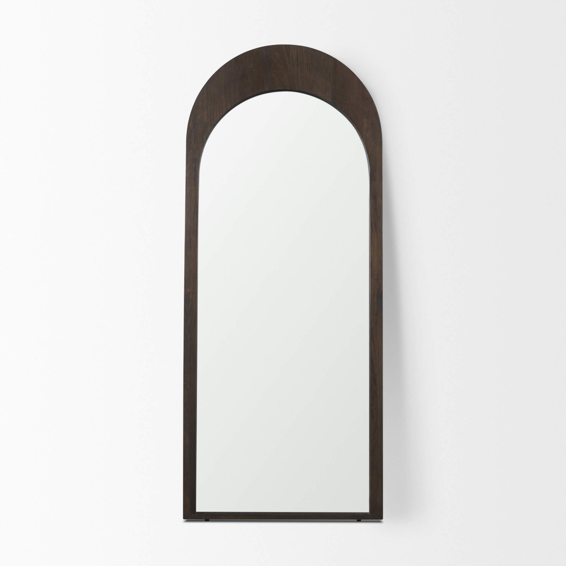 The full-length arched Celeste Mirror's style has been skillfully crafted of solid mango wood and in a rich dark brown with a smooth finish. Use in a hallway, bathroom, or bedroom to add mid-century modern flair.