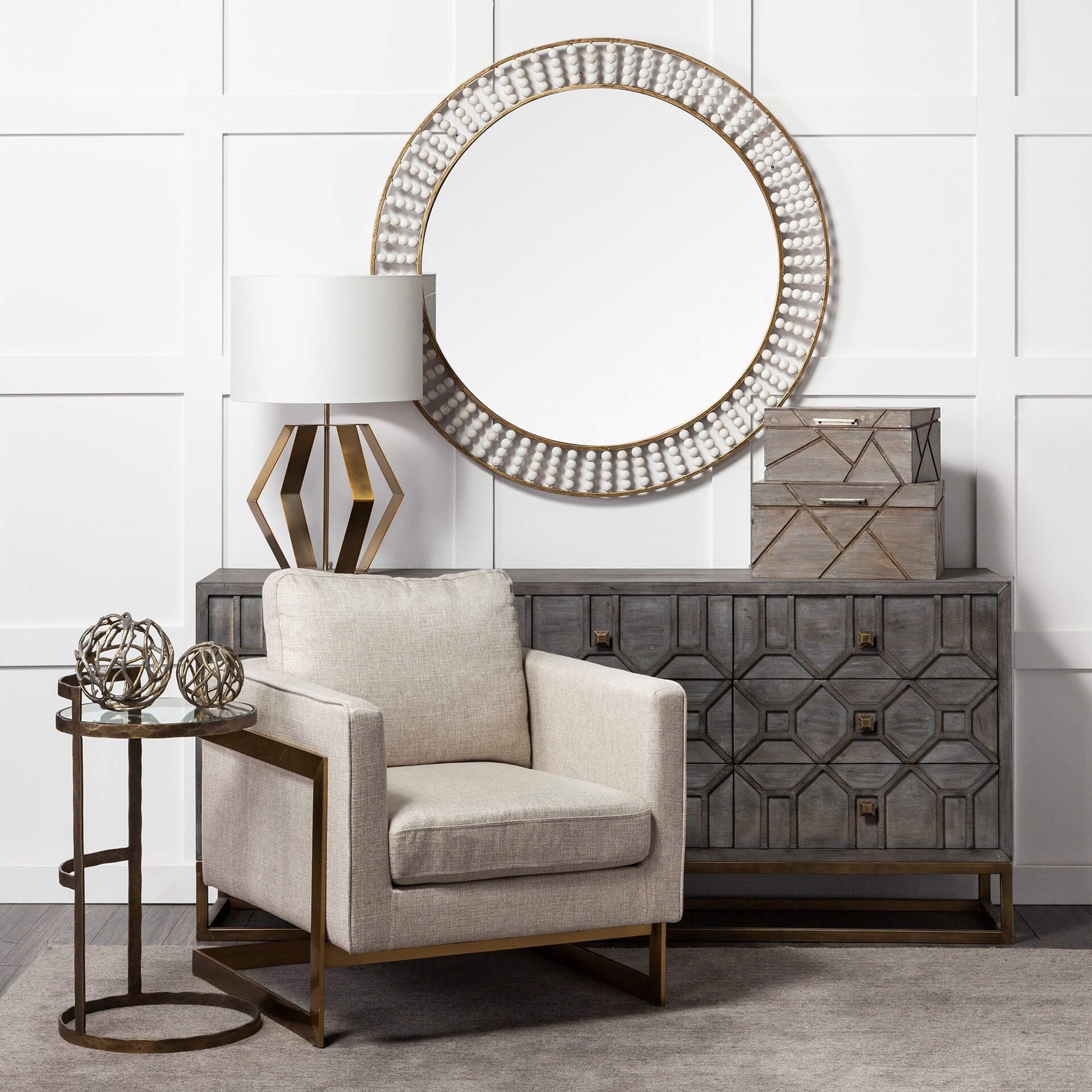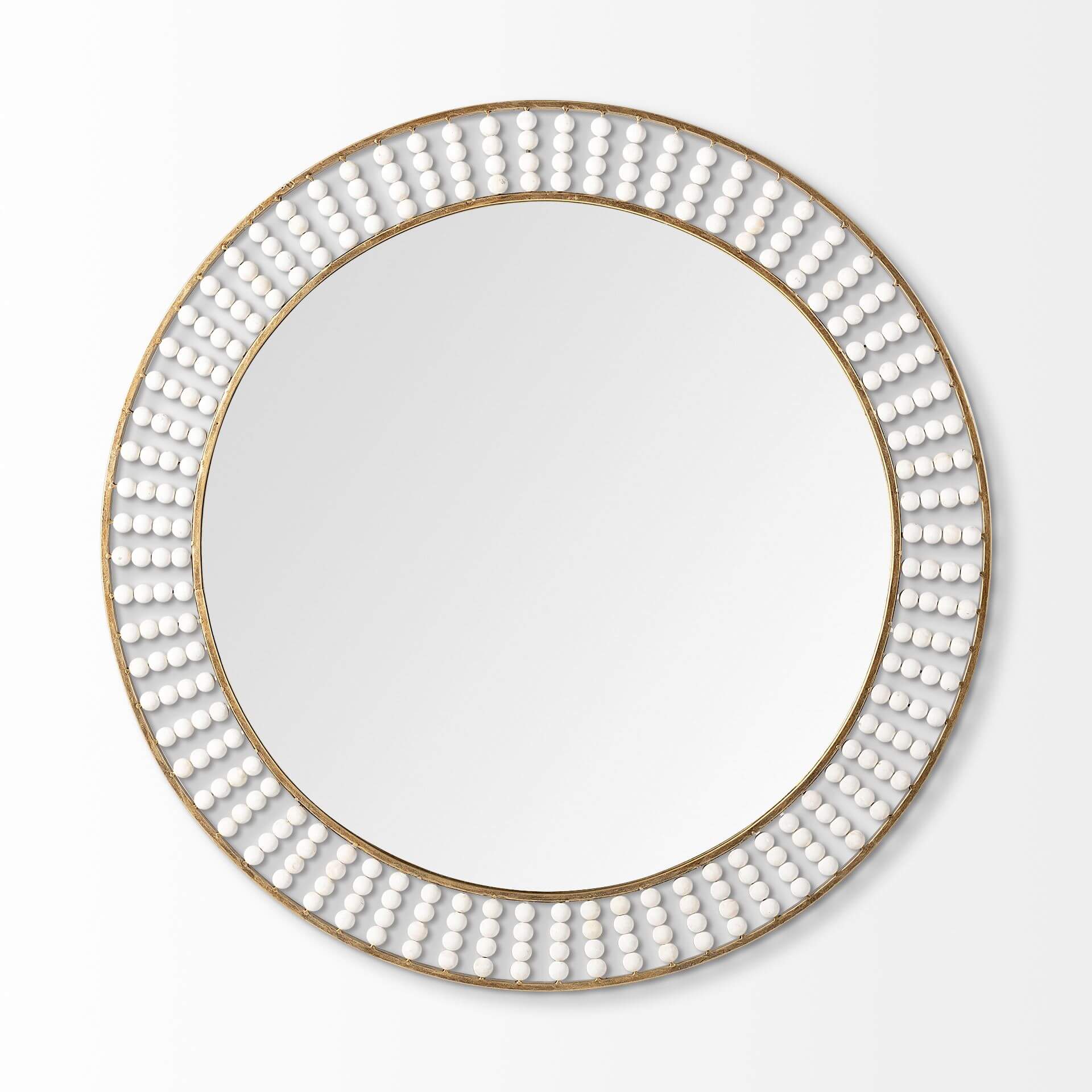 Crafted from metal and finished in a radiant, antiqued-gold tone, the Claiborne I is a stunning, double-framed round mirror with spectacular wooden bead details in a white tone. Spanning 42" in diameter, this stylish wall mirror looks gorgeous in any elegantly styled space and is guaranteed to add a touch of panache to your walls.