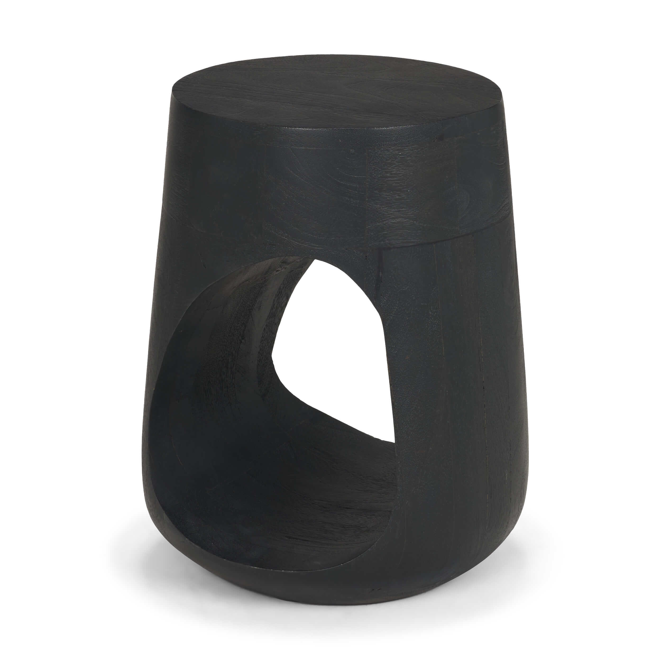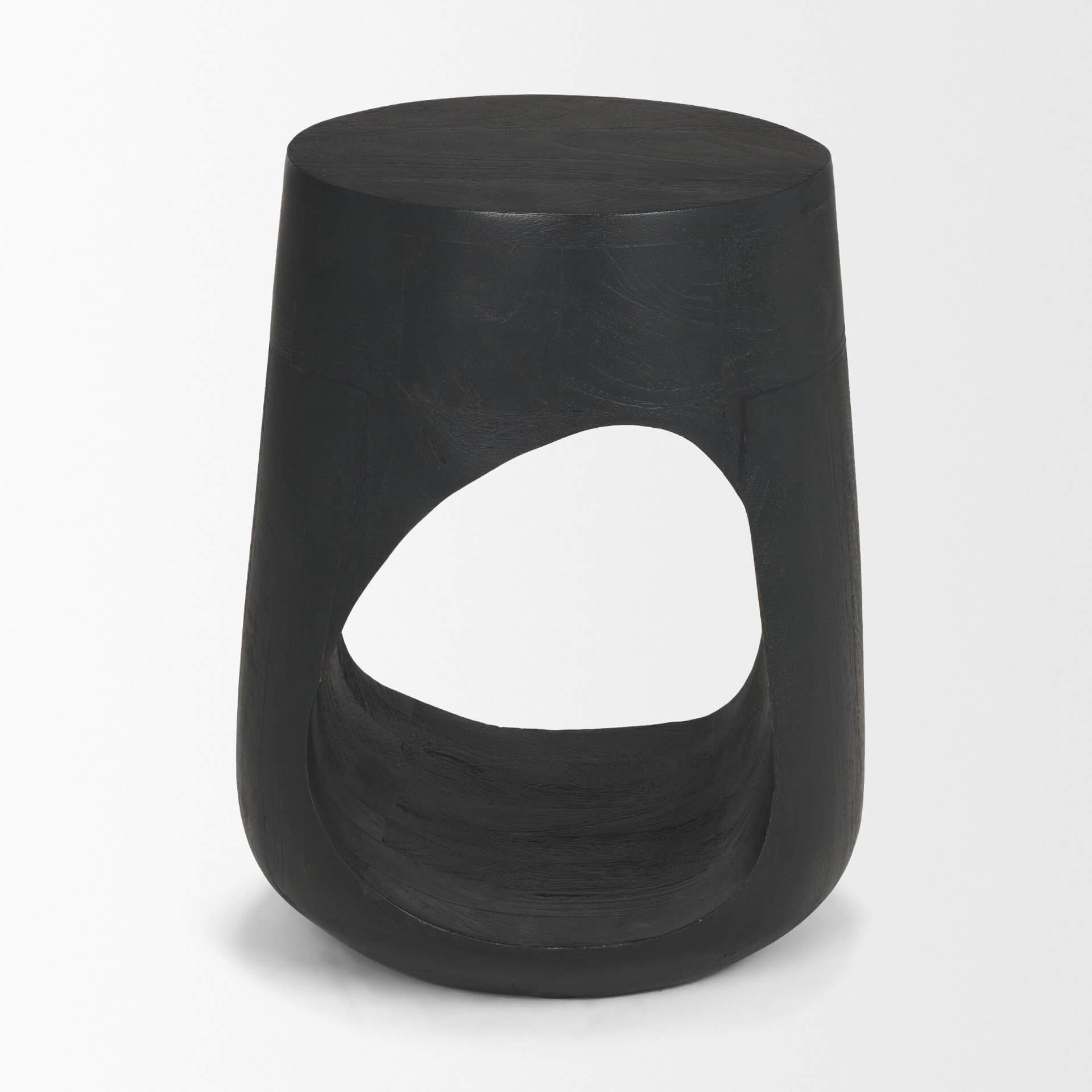 The Cayson Accent Table is defined by its bold, cove-inspired silhouette in solid mango wood, elevated by a matte black sandblasted finish that brings depth and modern edge to its sculptural form.