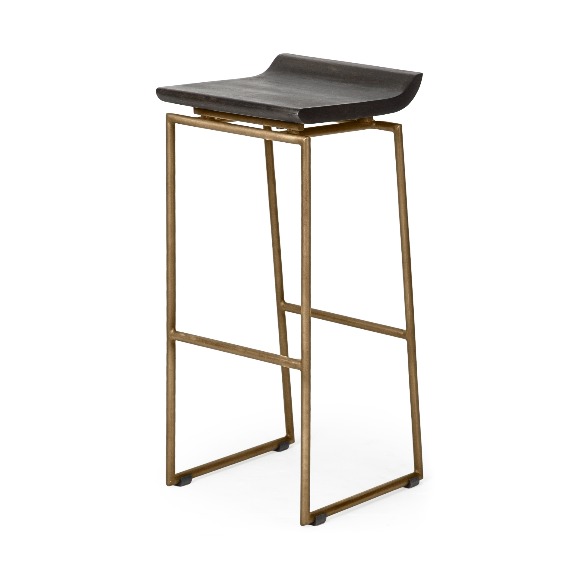 The Givens III is a bar stool featuring a contoured seat made from solid Indian mango wood and finished in a dark brown polish. The seat is mounted on a sturdy, antiqued-gold toned iron frame equipped with a footrest to ensure a comfortable seating experience. The Givens III fits well in spaces that are based on the Industrial design style.