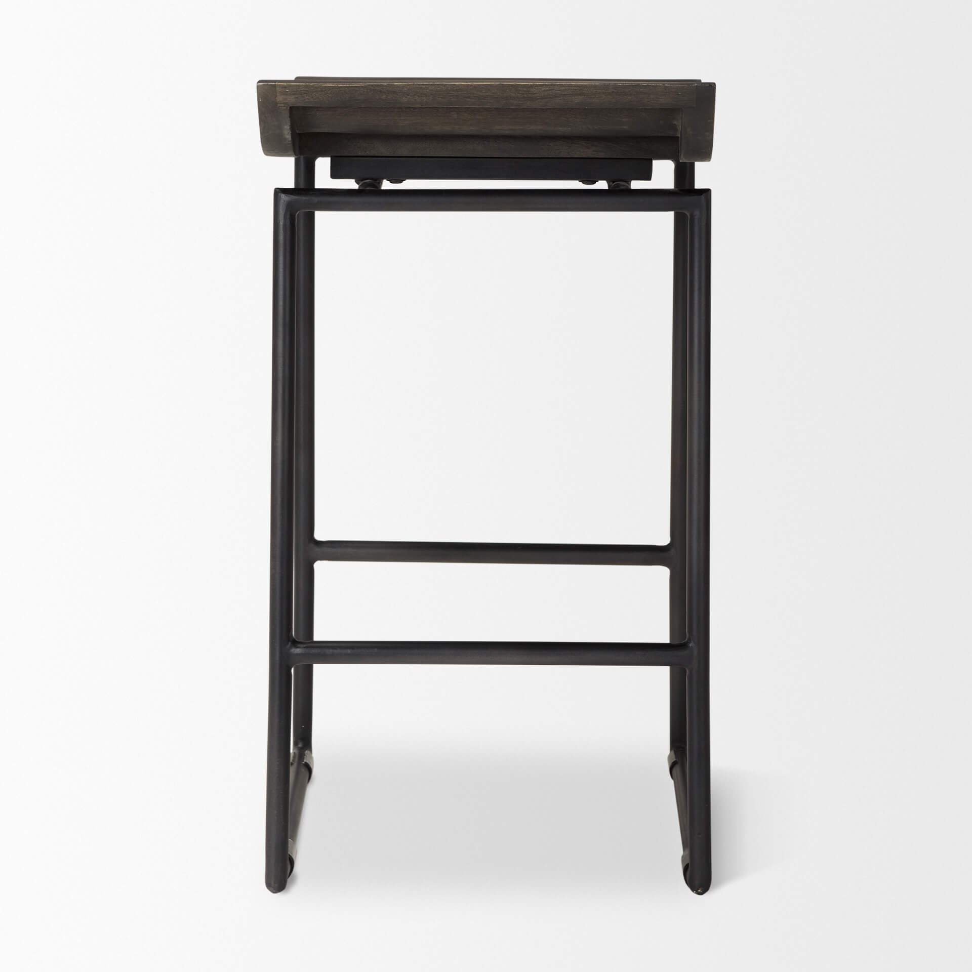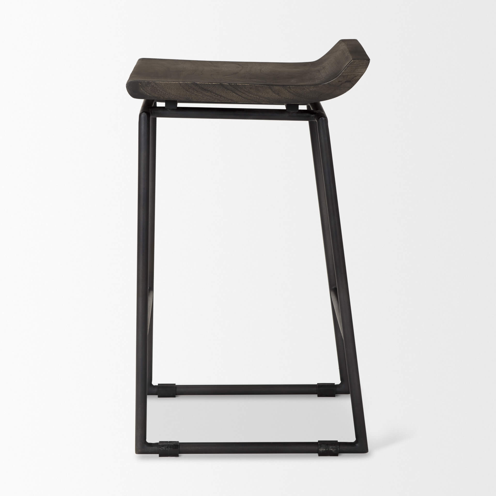The Givens IV is a counter-height stool featuring a contoured seat made from solid Indian mango wood and finished in a matte-black polish. The seat is mounted on a sturdy, matte-black toned iron frame equipped with a footrest to ensure a comfortable seating experience. The Givens IV fits well in spaces that are based on the Industrial design style.