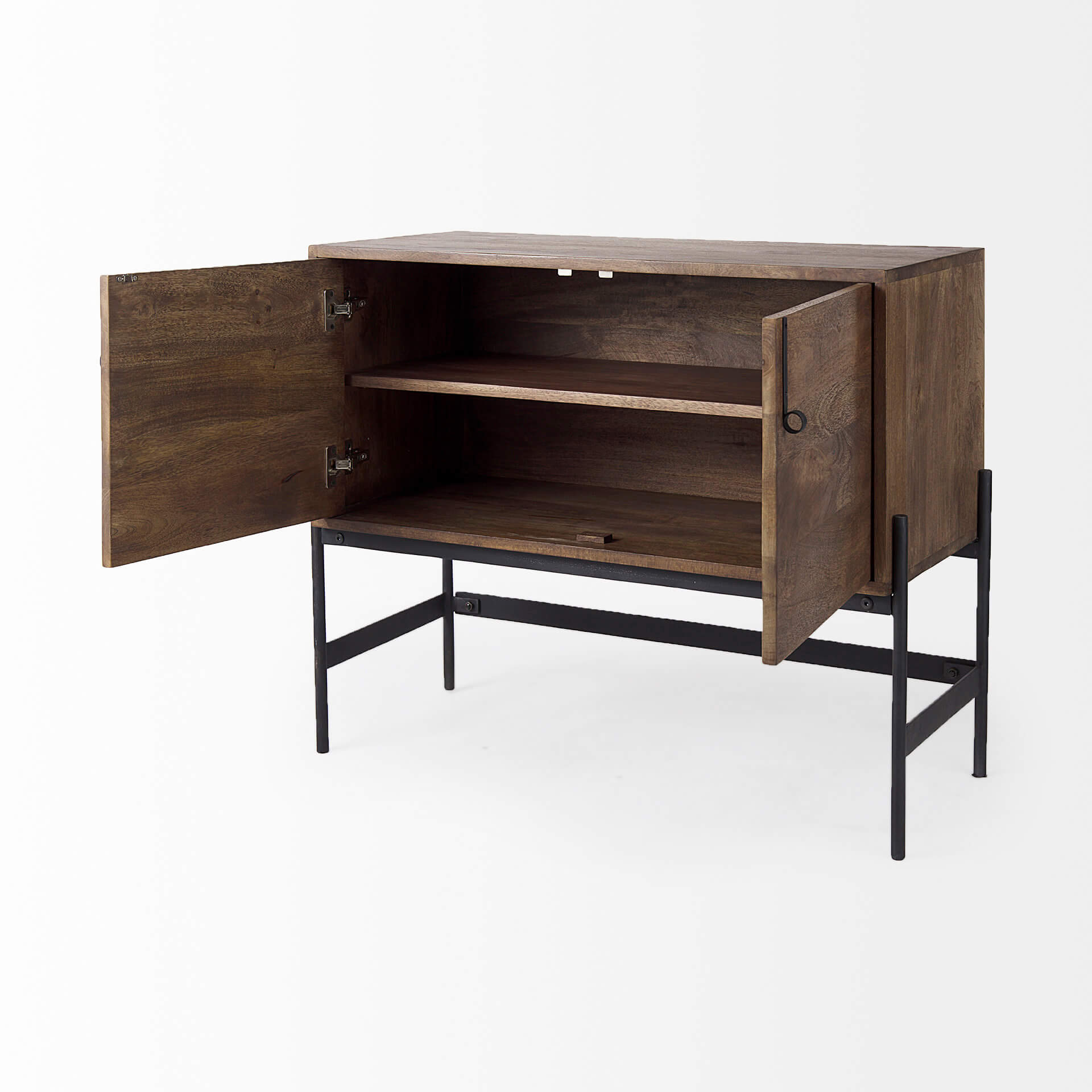- Solid Wood and Metal ConstructionThis modern accent cabinet features a Mango wood body with two doors and two interior shelves that run along the length of the cabinet. The body is supported off the floor by a sturdy, iron frame that reduces its visual weight.