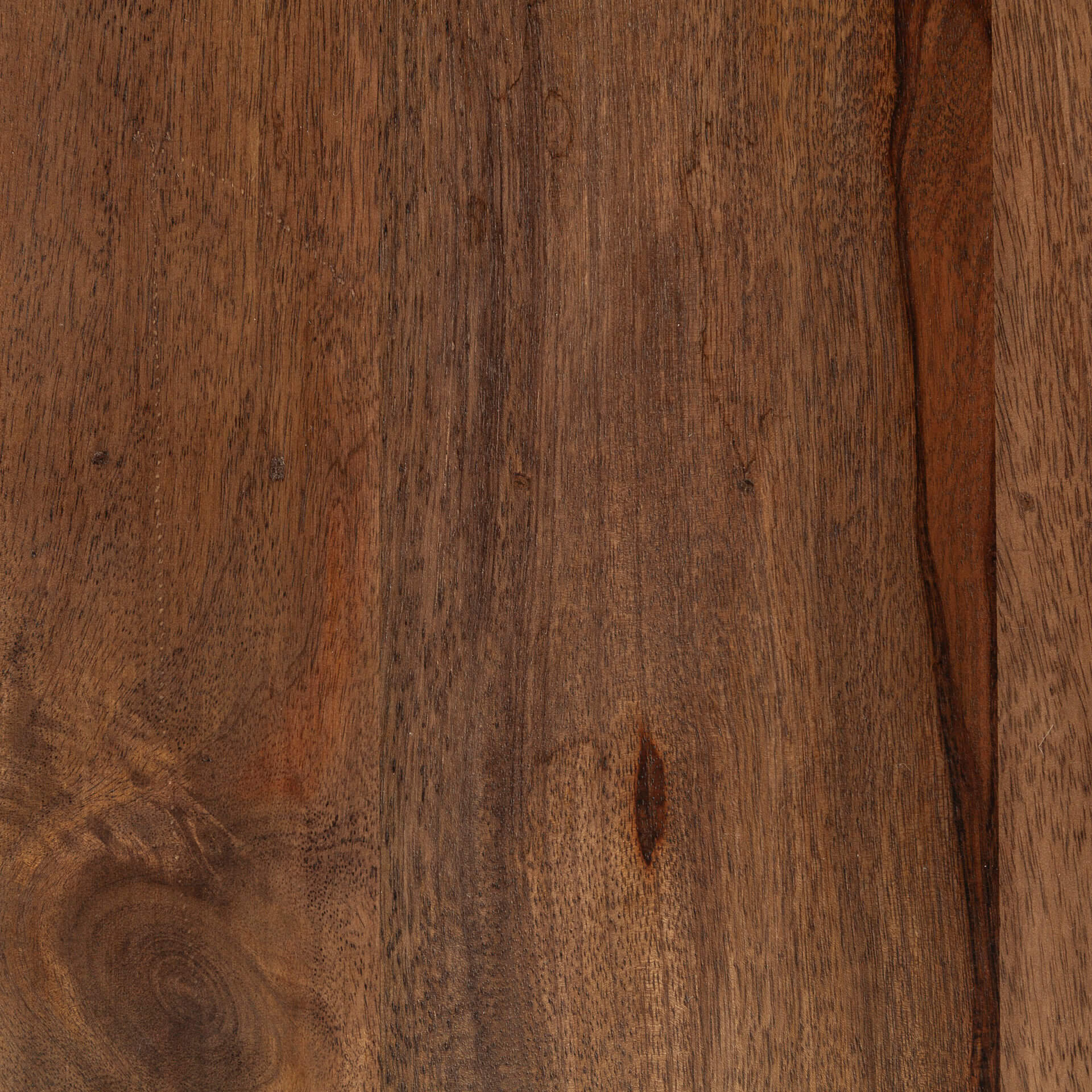 - Dark Brown and Black FinishThe wood is smooth textured in a dark brown finish that lets its natural character show through. The iron legs have an unfussy, matte black finish.