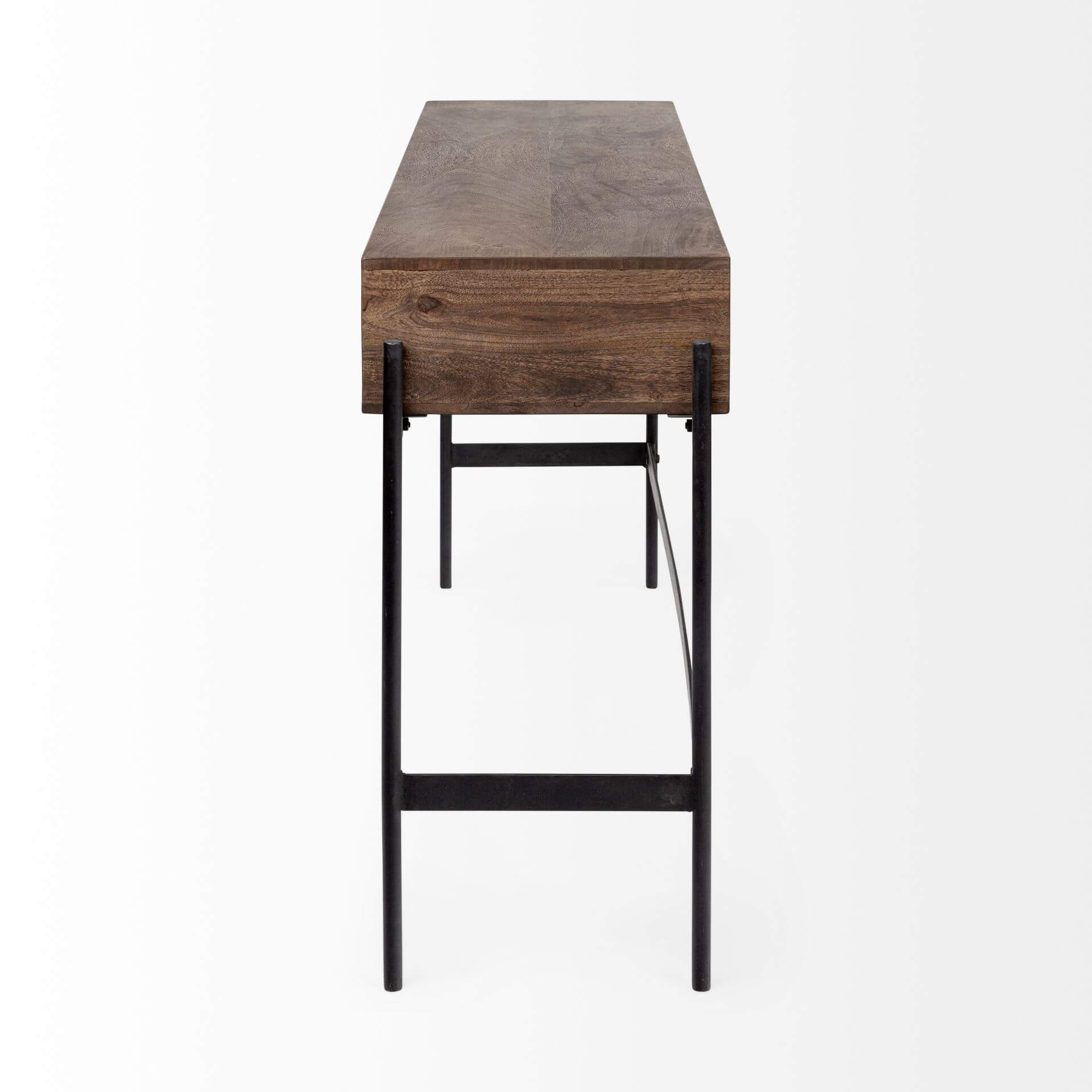 - Sturdy Construction The Glenn III console table, finished in a two-tone palette with a black metal frame and a medium brown chassis, is expertly crafted from solid wood and iron components. This makes for a sturdy and substantial addition to your space which is built to stand the test of time.