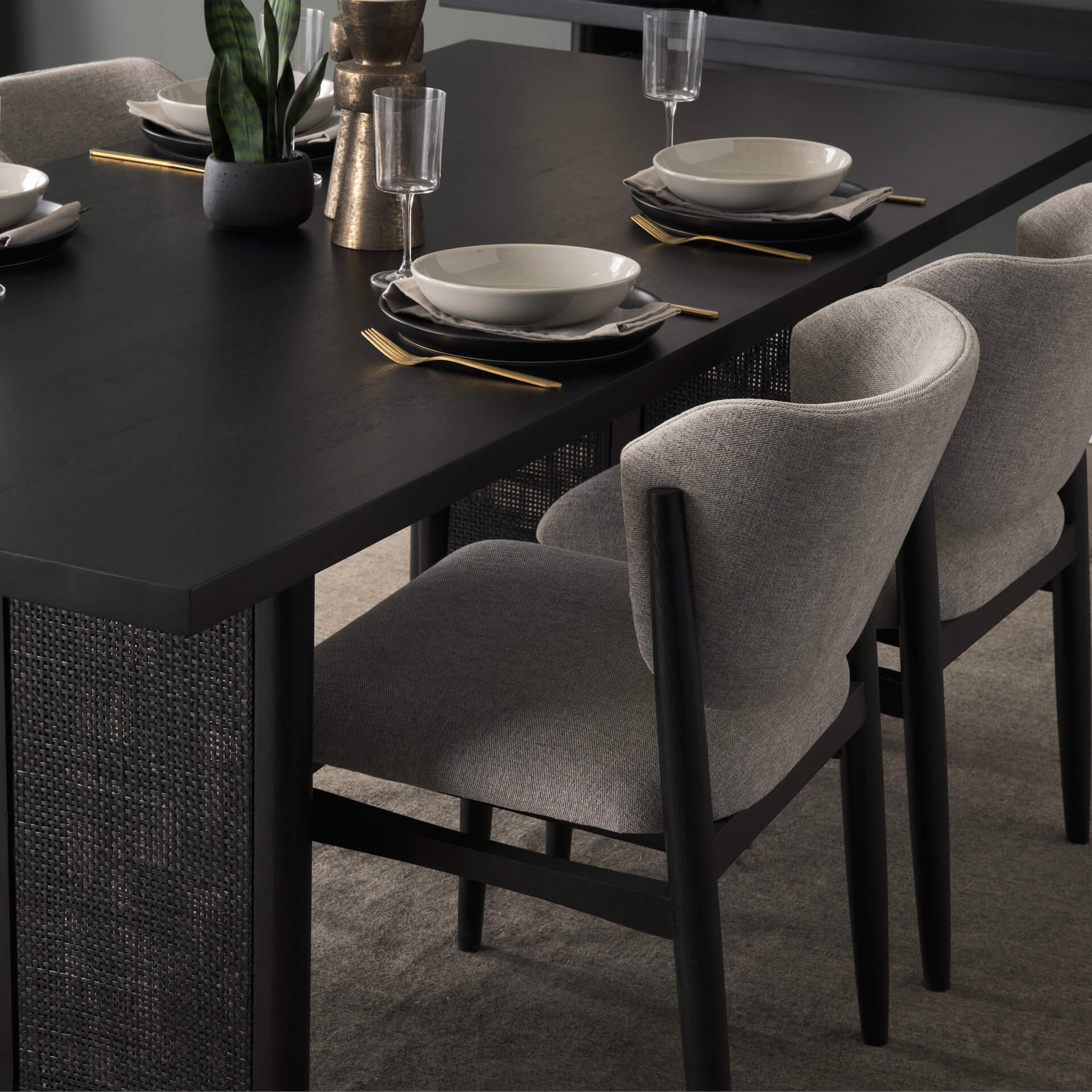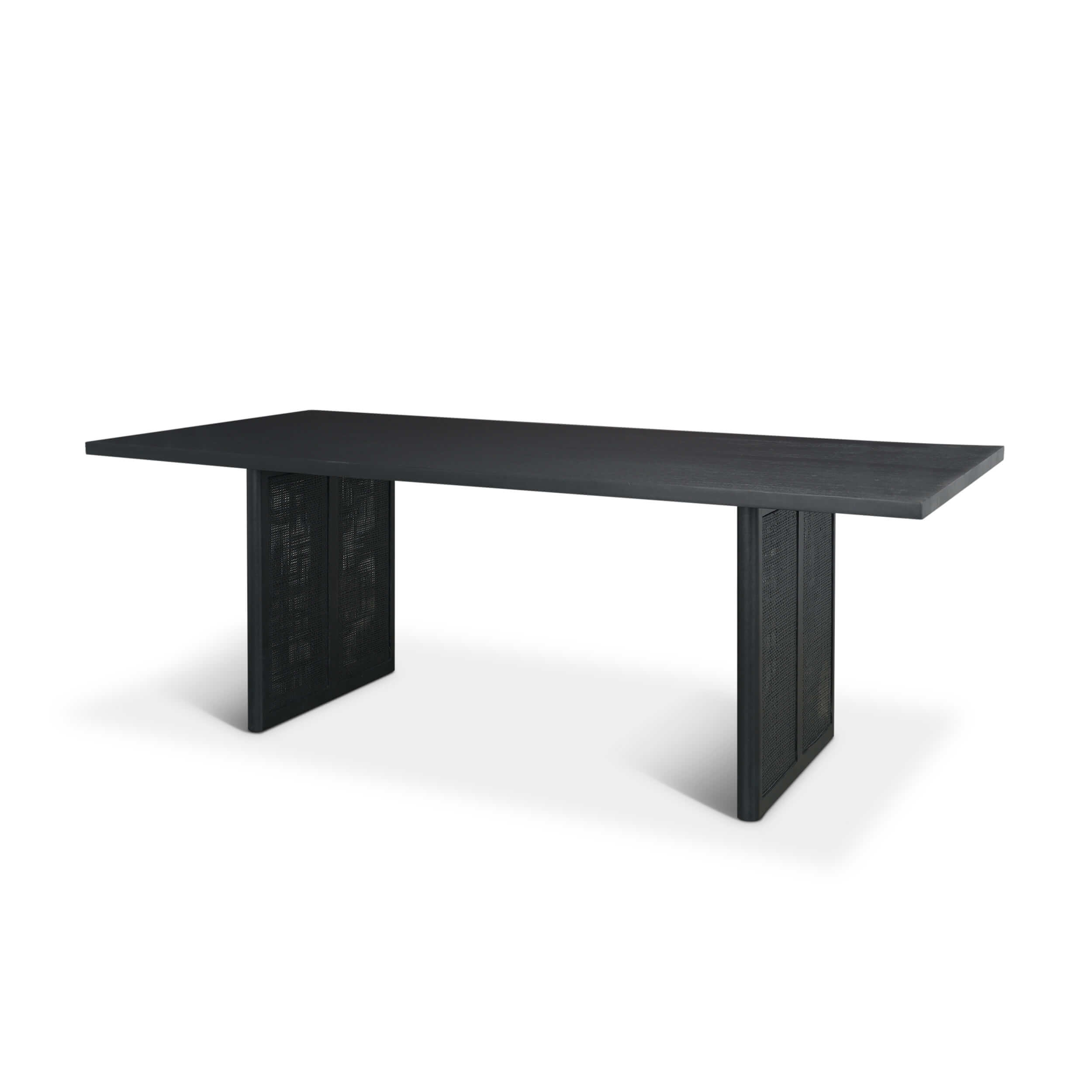 The Grier Dining Table is crafted from solid mango wood in a matte black finish, paired with natural cane paneling for a striking contrast of tone and texture. Its clean lines and organic materials bring a relaxed yet refined presence to any space. Thoughtfully designed for both function and style, it works well in modern, coastal, or transitional interiors. A statement-making centerpiece for everyday dining or elevated entertaining. Pair with other pieces in the Grier Collection to create a cohesive and curated space.