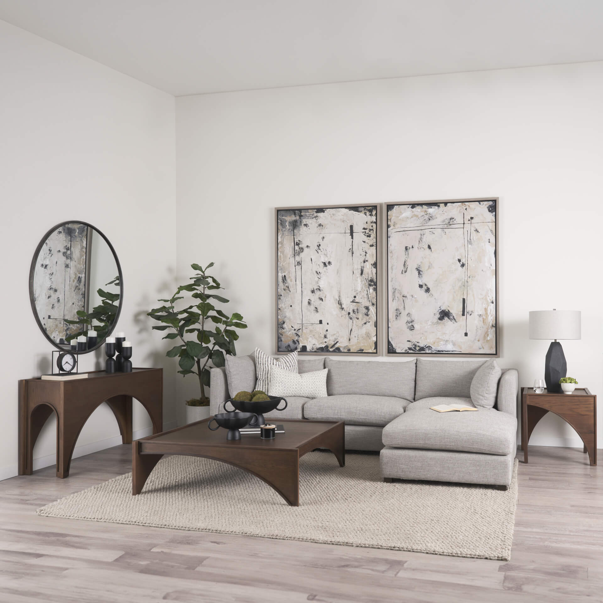The Laraya End Table boasts intriguing semi-arched framed legs and a refined square tabletop. Expertly crafted from solid oak, the frame ensures stability, while the tabletop, featuring oak veneer on engineered wood, adds durability. In a contemporary design, this accent table exhibits a smooth finish with a rich dark brown stain, highlighting the inherent beauty of the oak. A standout addition to the Laraya Collection.