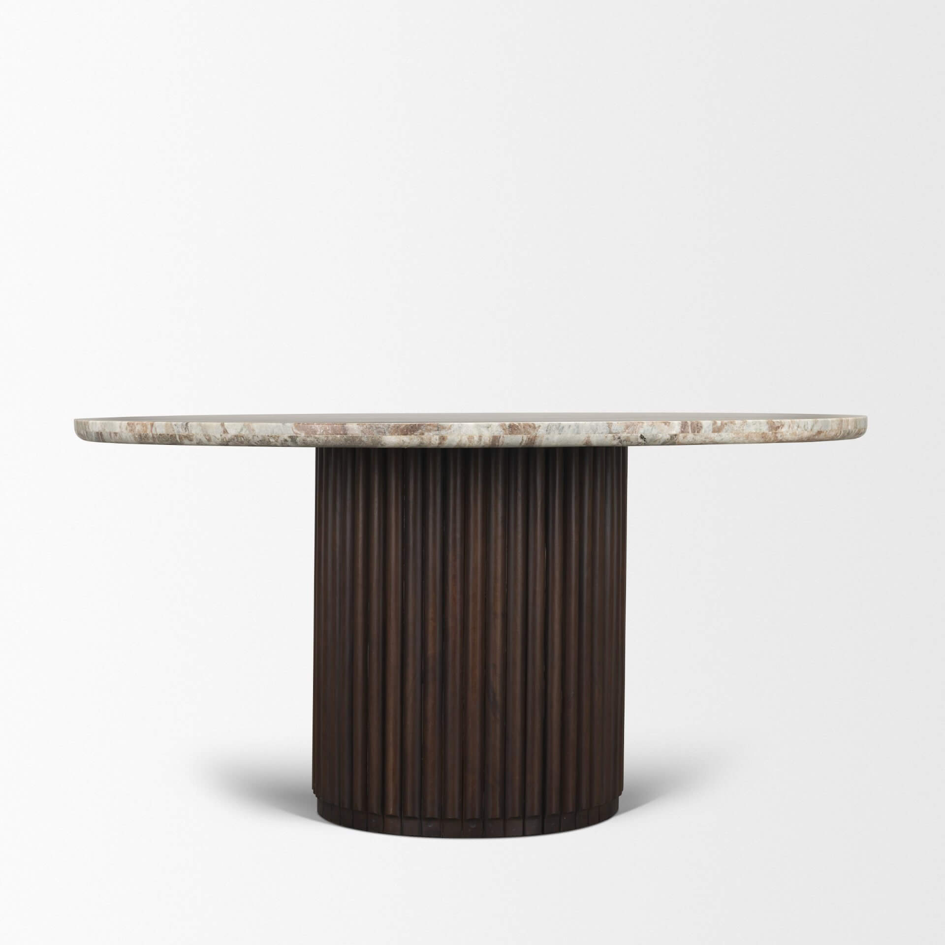The Marbrello Dining Table features a round solid pink marble top set on a fluted espresso-finished base with a recessed bottom for sculptural balance.