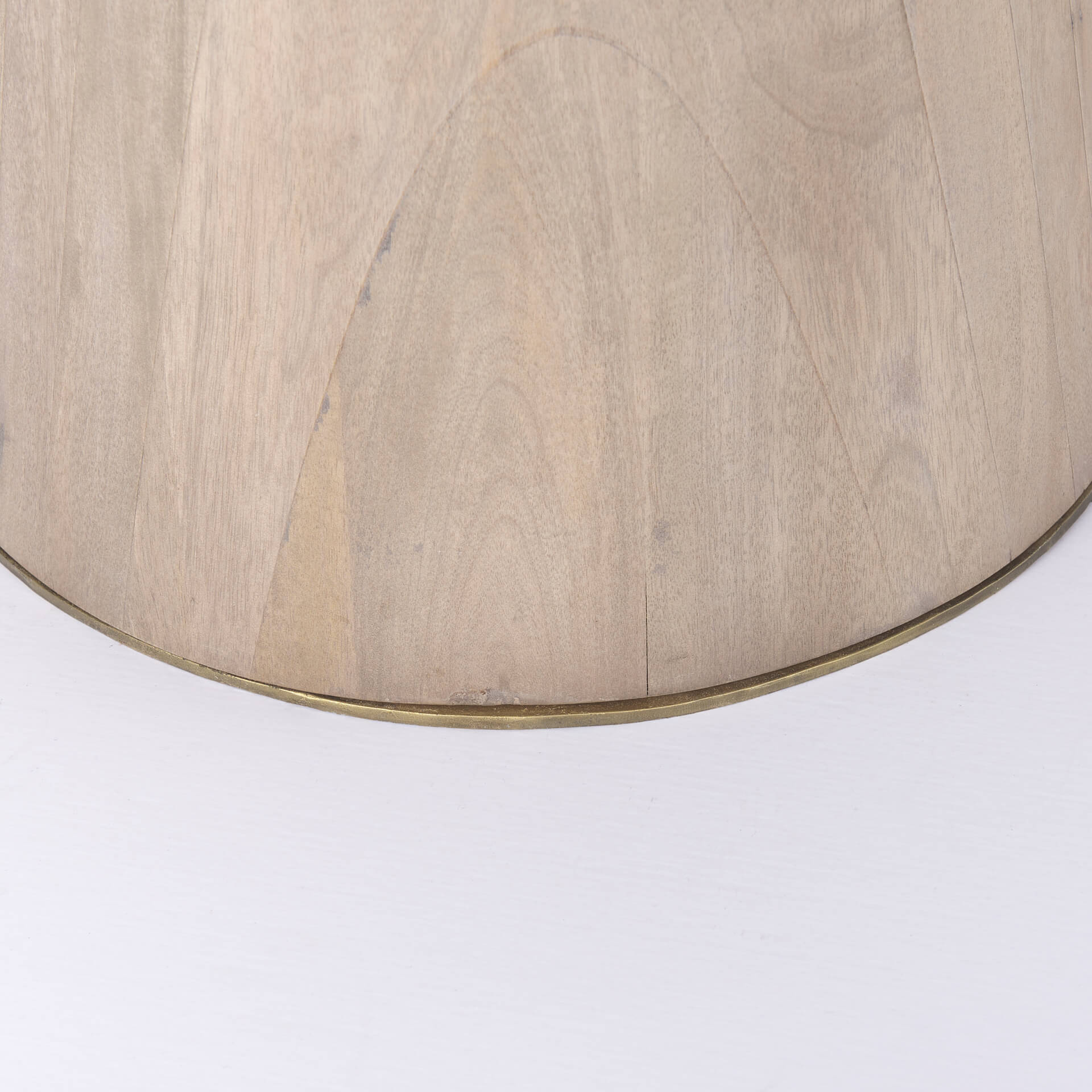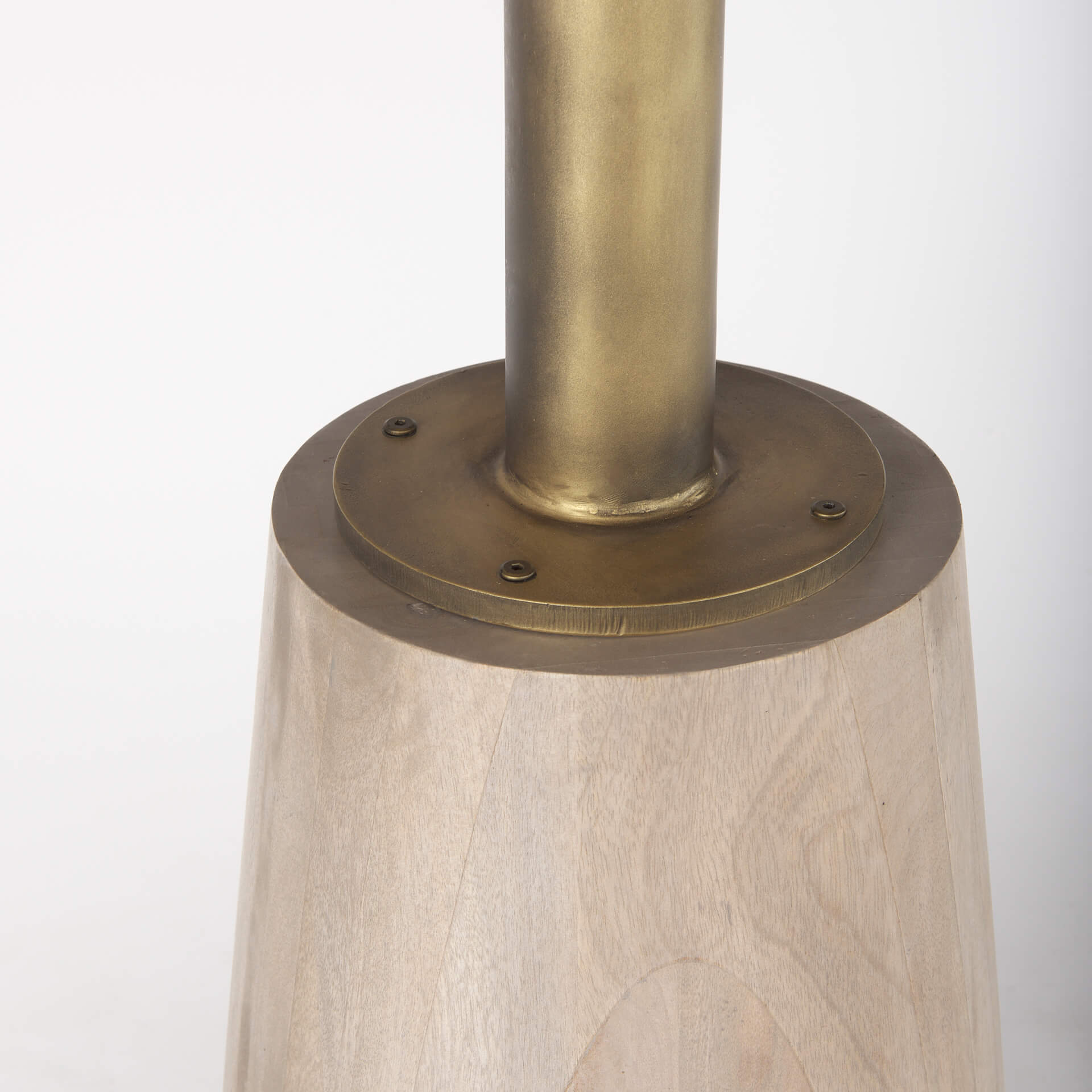 This Maxwell Bistro Table is a simple, round top made from solid Mango wood that sits upon brushed-brass metal finish pedestal anchored by a tapered wooden base. The slender profile and solid mango wood top’s smooth light brown finish is an understated, yet elegant design.
