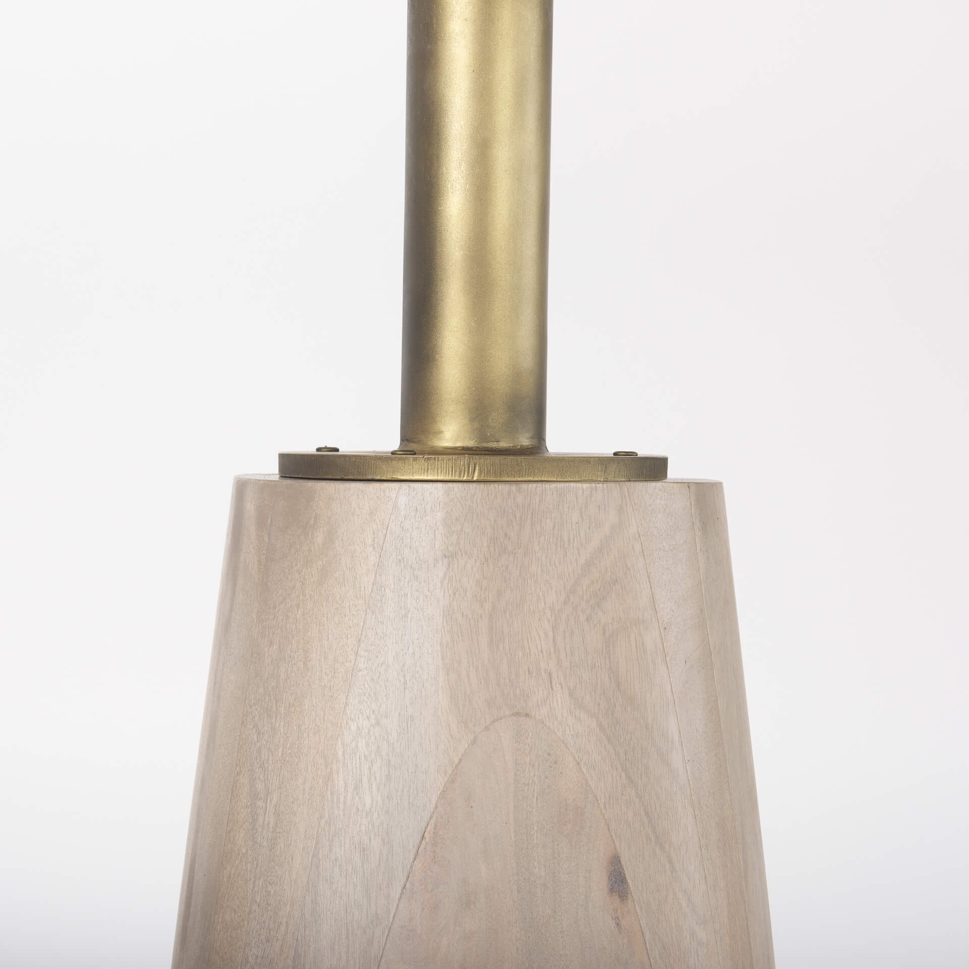 - Materials This Maxwell simple, round tabletop made from solid Mango wood sits upon an iron pedestal anchored by a tapered wooden base. The smooth, light brown finish of the wood tabletop and base complements the brushed-brass metal finish pedestal neck.