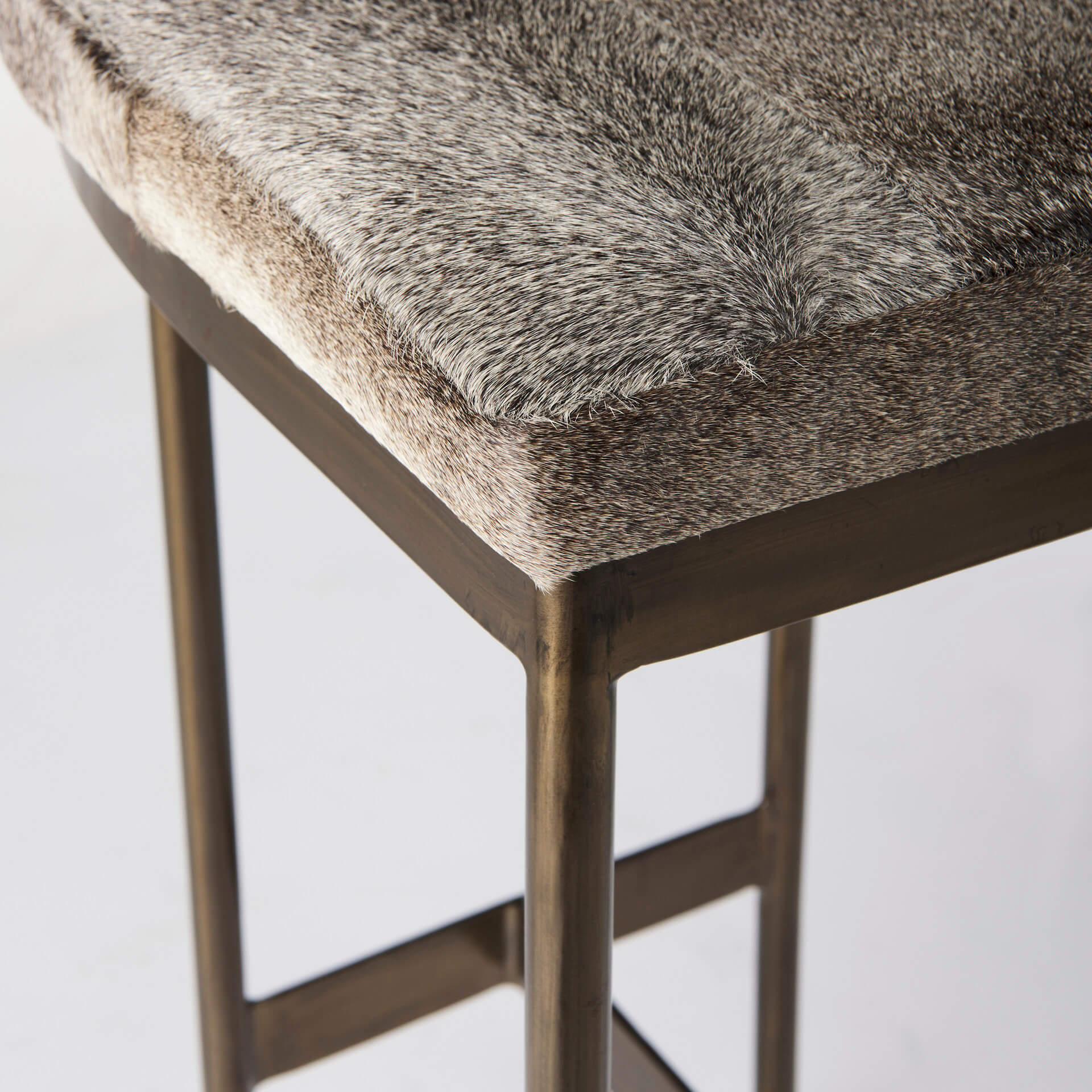 - Finishing TouchesThe Millie showcases a unique and short-haired textured seat, finished in a natural hair-on-hide with variations of brown, gray, cream. The legs are sleek and sturdy and are finished in a gold polish.