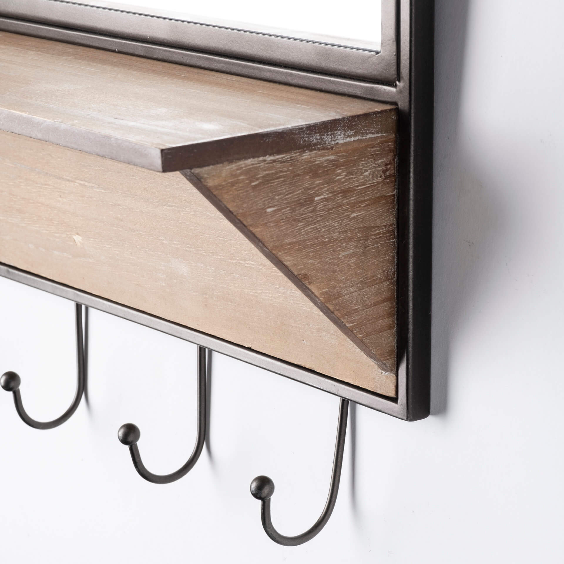 Crafted from metal and wood, the Neville is a stunning, oval-shaped wall mounted mirror featuring a shelf in addition to five hooks that can host keys and other small artifacts. The Neville flaunts a minimal design that ensures it is a good fit in any space and setting.