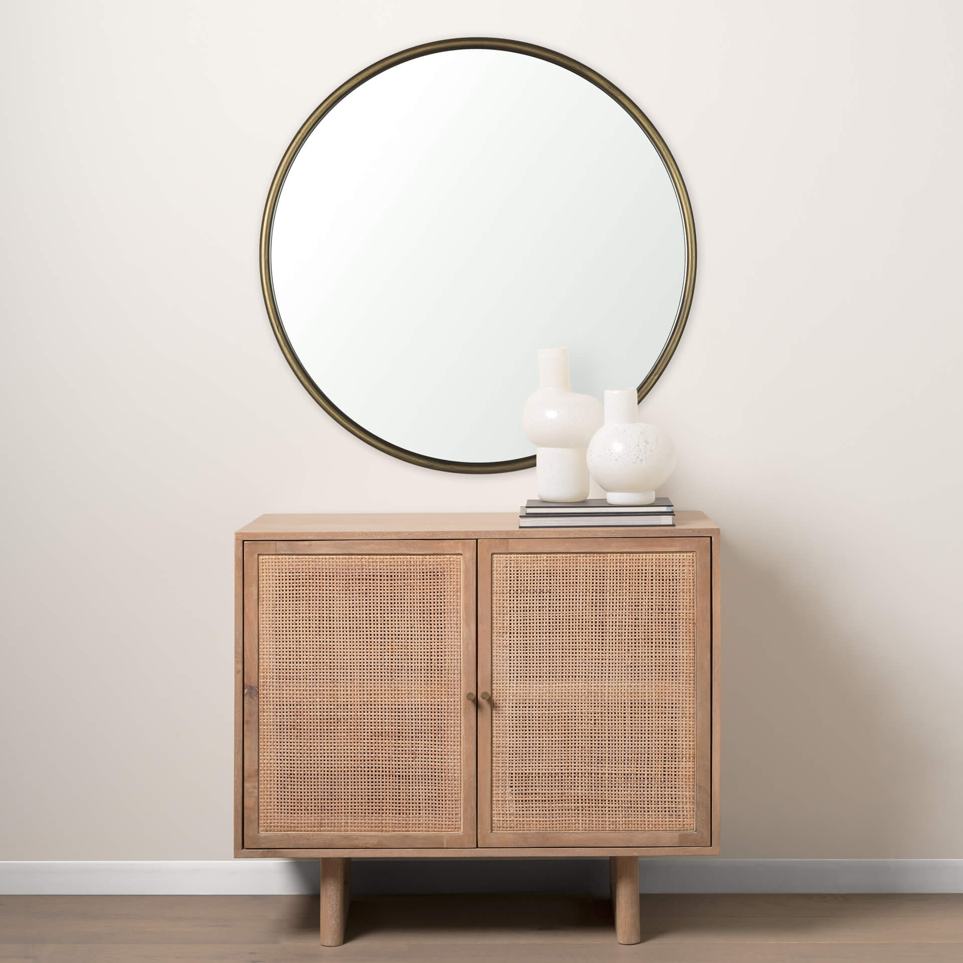 A simple round metal mirror boasting versatile style