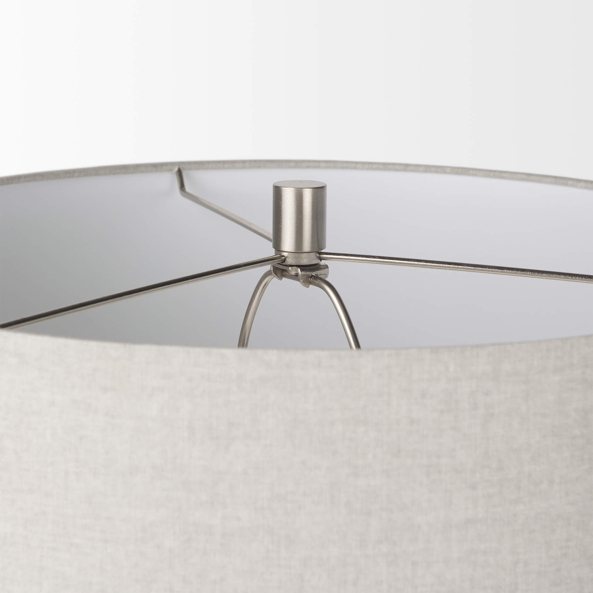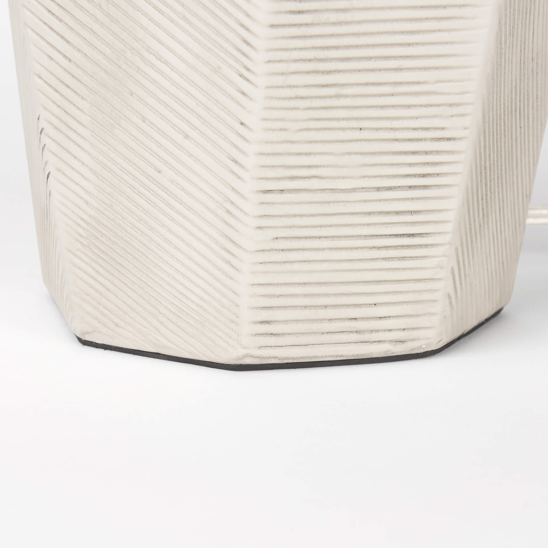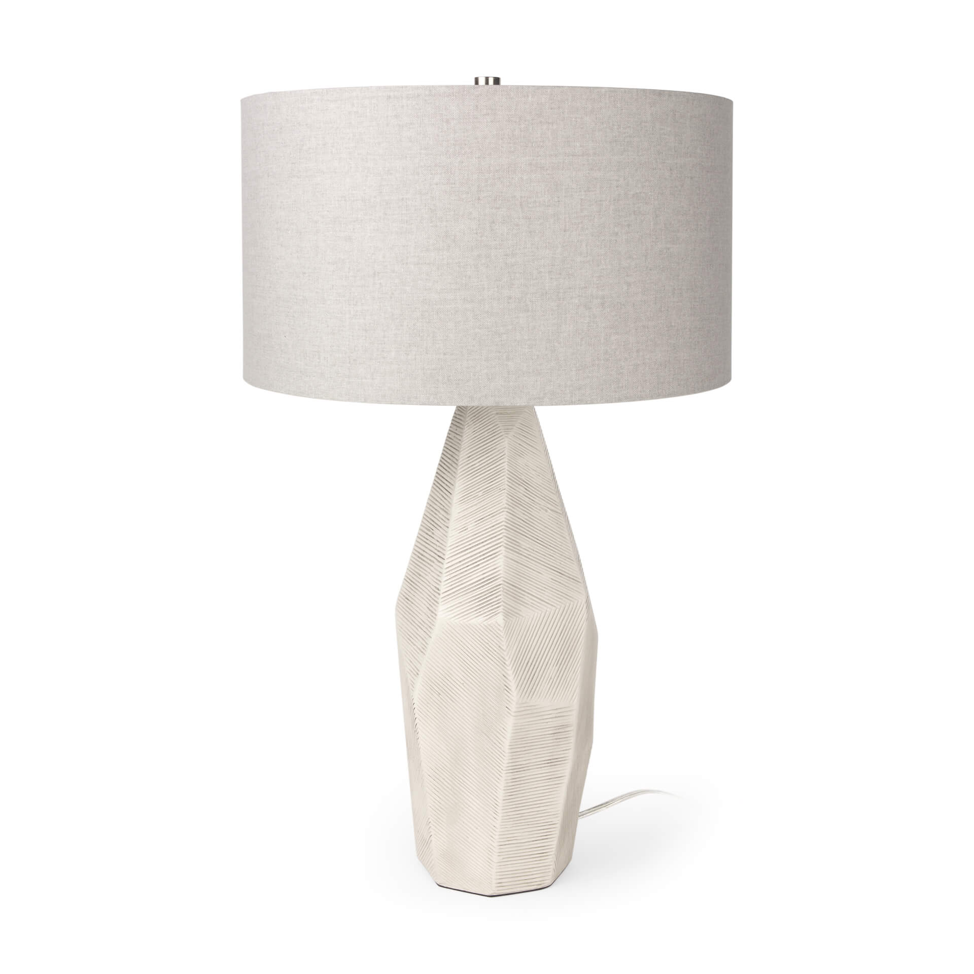 - Superior Finish Featuring a mix of materials and colors, the Piven is a spectacular table lamp that boasts of a geometric, ceramic base finished in matte white with an antiqued wash that softens the design and complements the beige fabric lampshade.