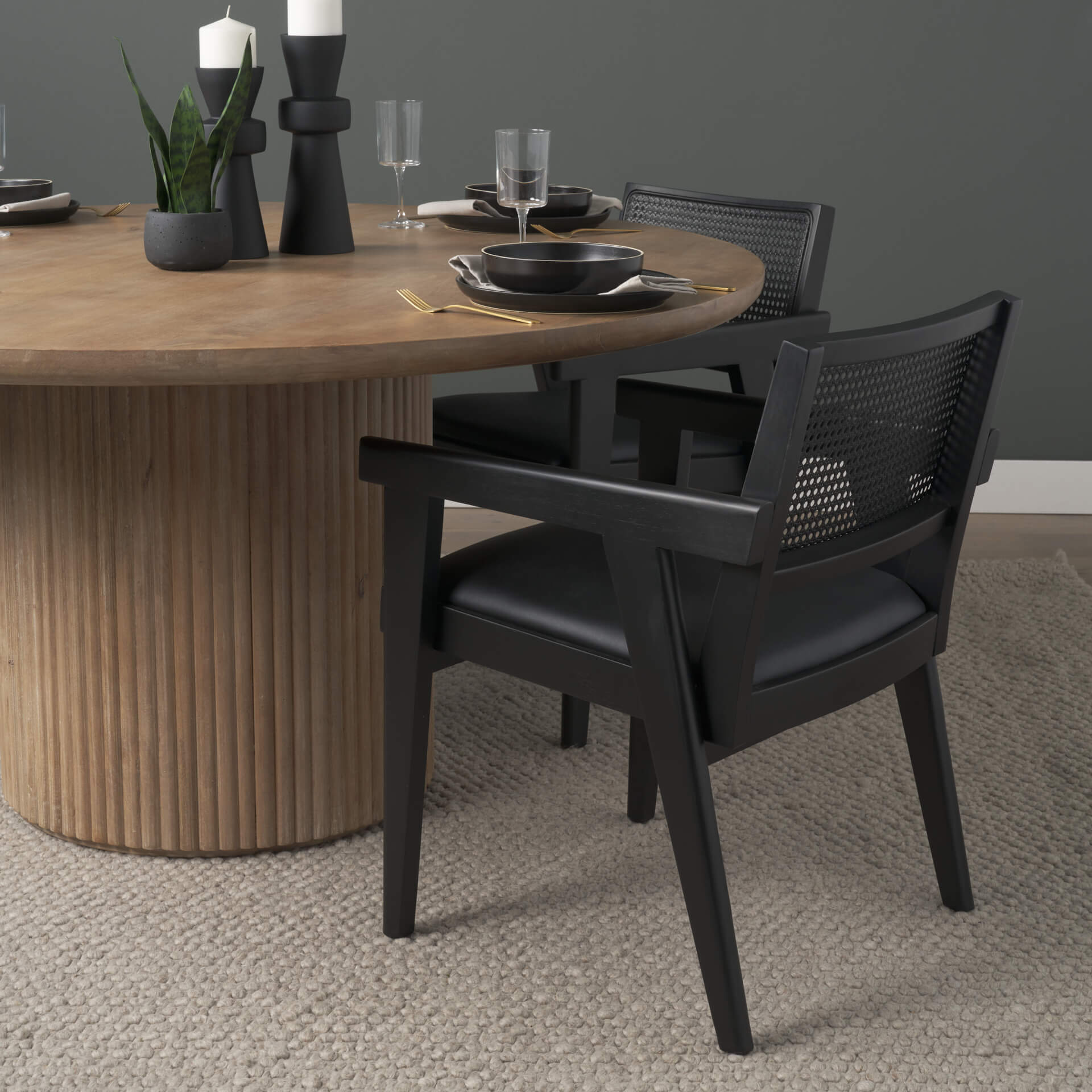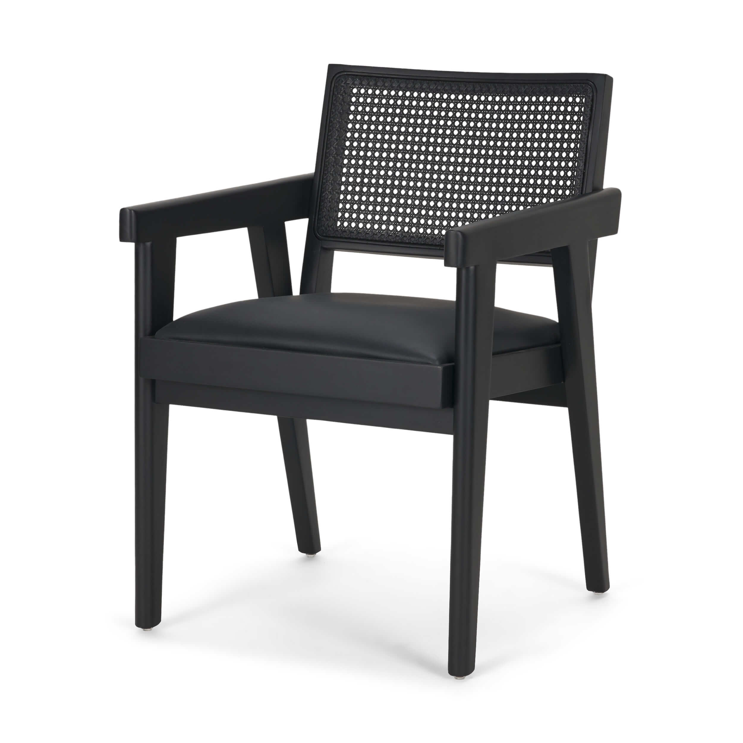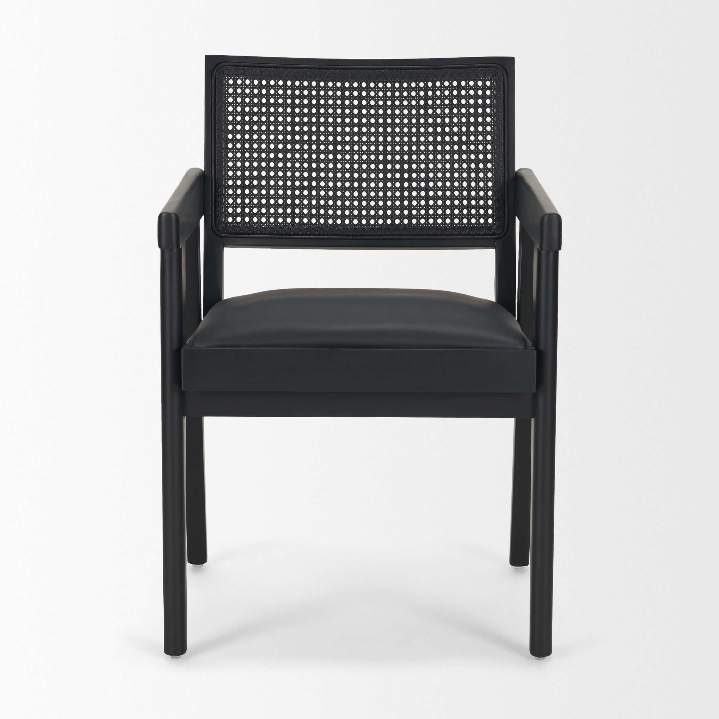 The Reid Armchair reimagines mid-century design with sculptural lines and modern edge. A black rubberwood frame and integrated arms offer structure and comfort, while handwoven cane and black leather balance texture and sophistication for a striking dining statement.