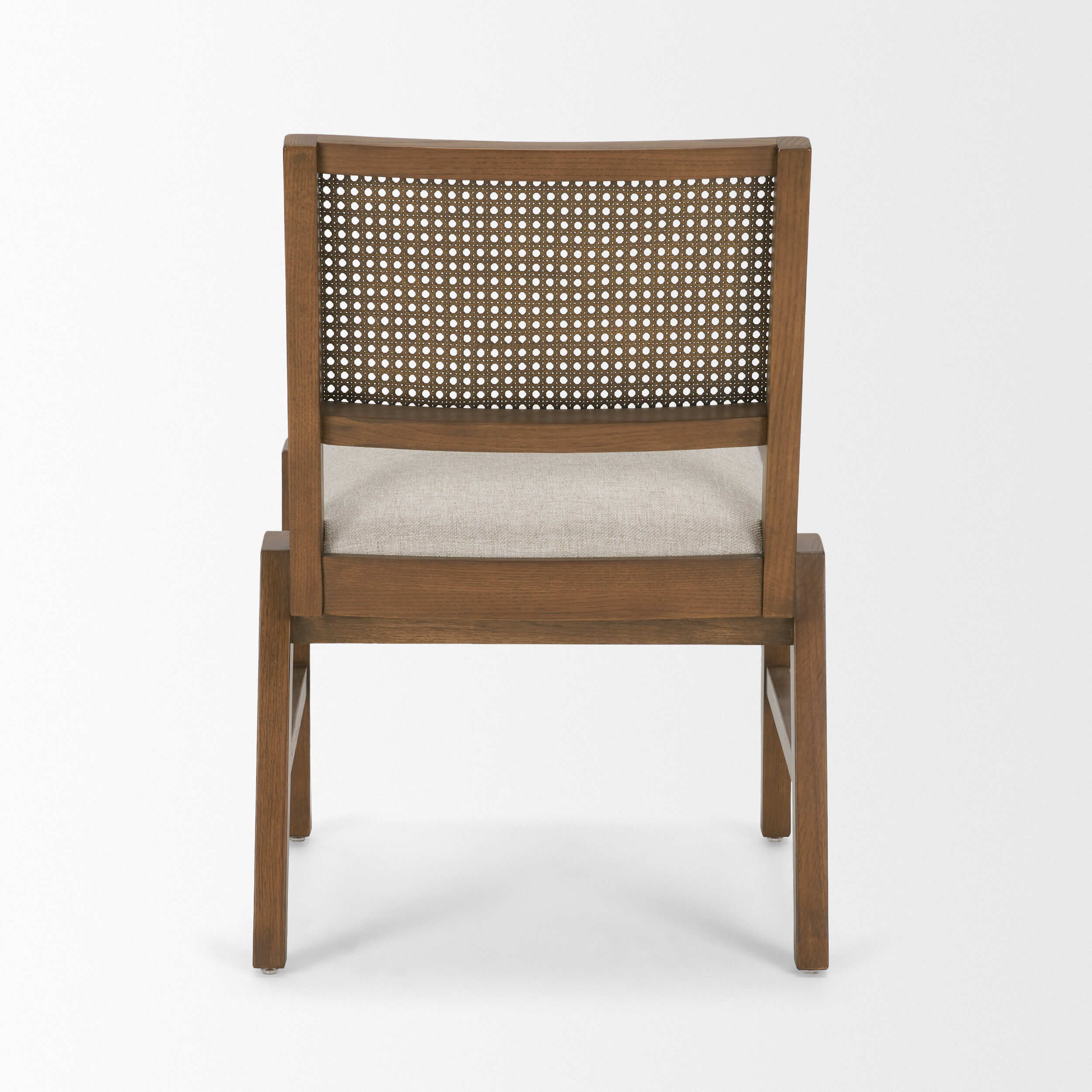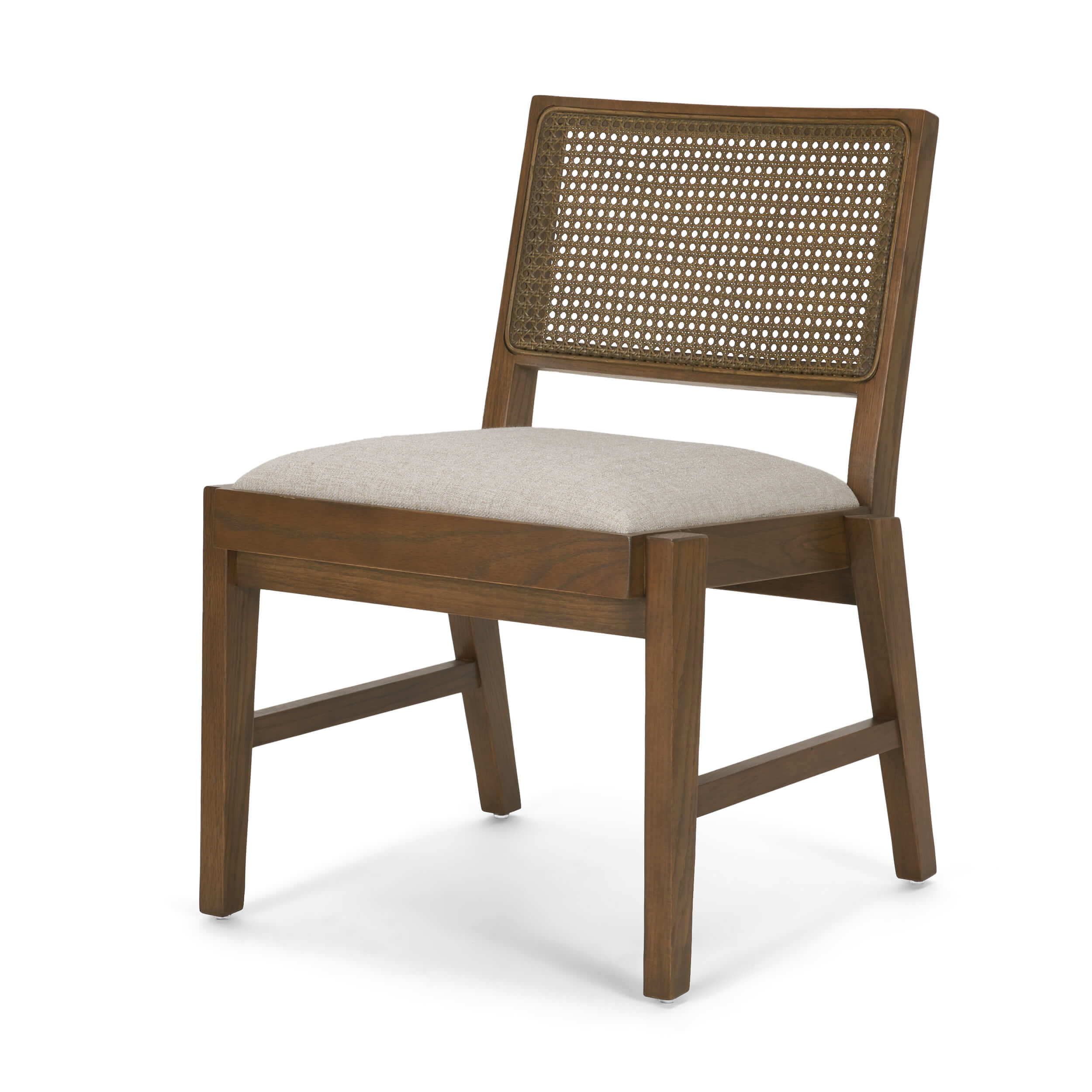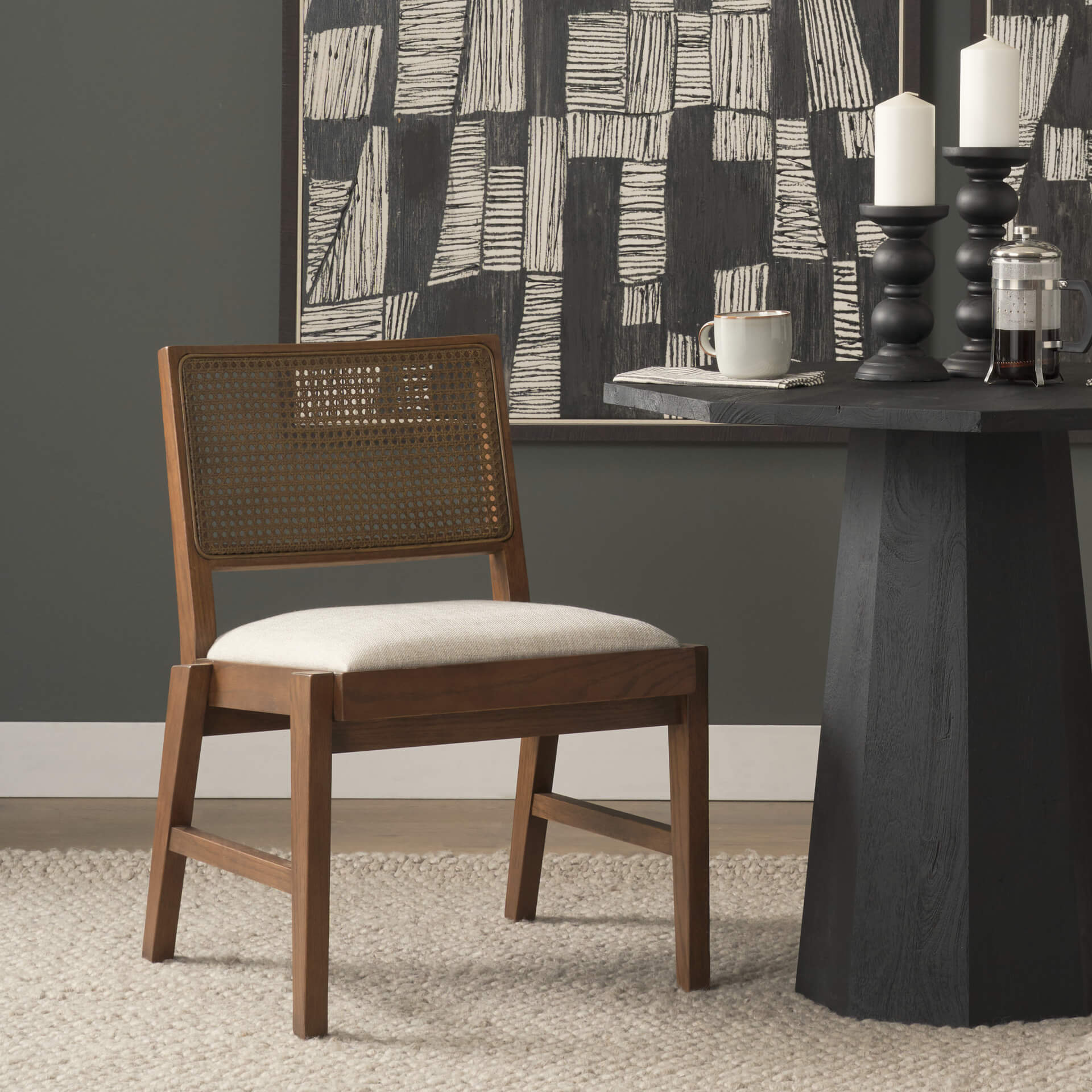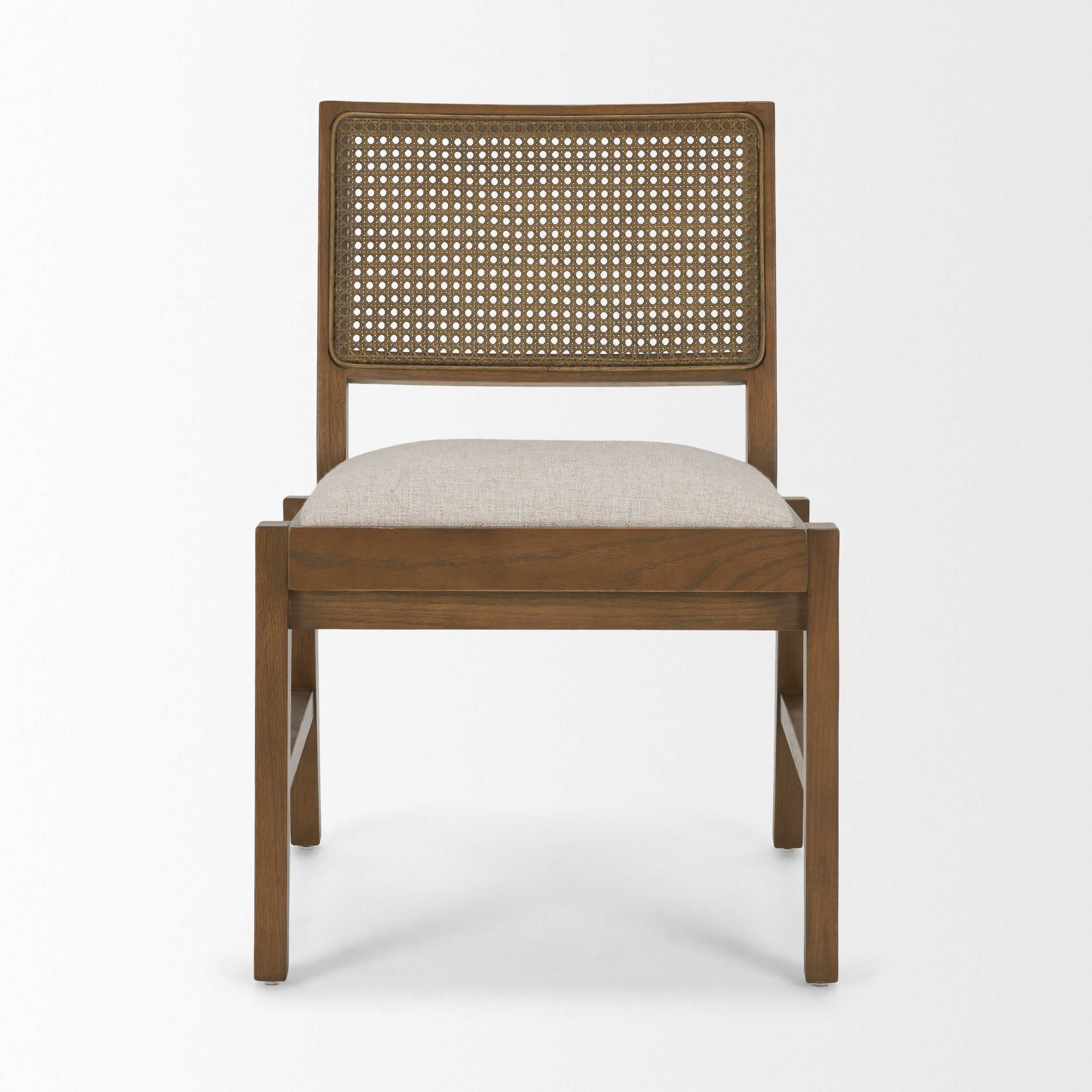 A refined nod to mid-century craftsmanship, the Reid side chair blends warmth and elegance with its solid oak frame in a rich brown finish. The handwoven cane back adds airy texture and artisanal charm, while the plush cream linen-blend seat offers tailored comfort and everyday durability. Perfectly balanced in profile and proportion, this chair elevates any dining setting with timeless character and ease.