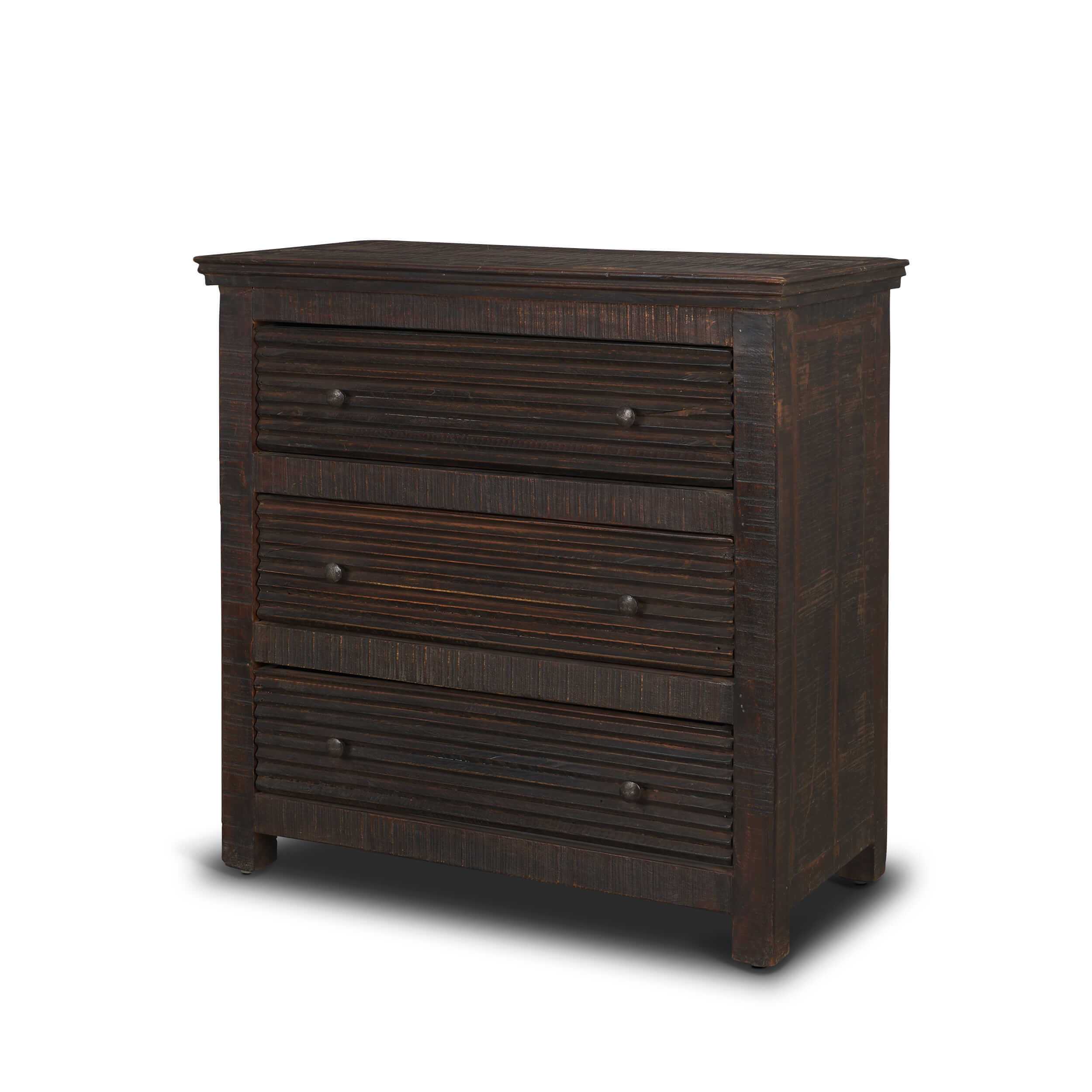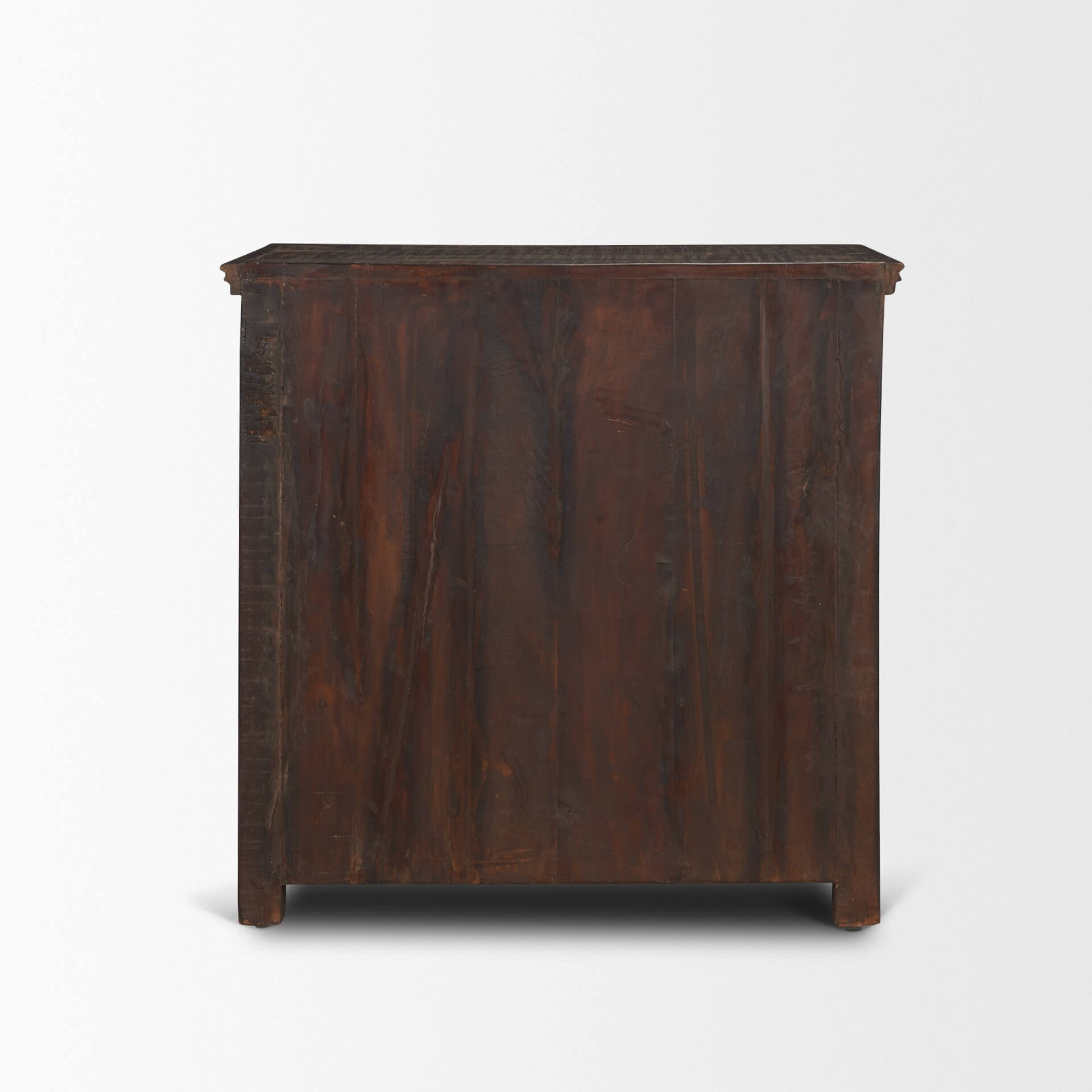 The Rhett 3-drawer accent cabinet is crafted entirely from reclaimed wood in a mid-dark brown finish with red undertones, highlighting its natural imperfections and rich character. Sharp-ridge carved fronts and rustic iron knobs bring added texture and a timeworn, handcrafted appeal.