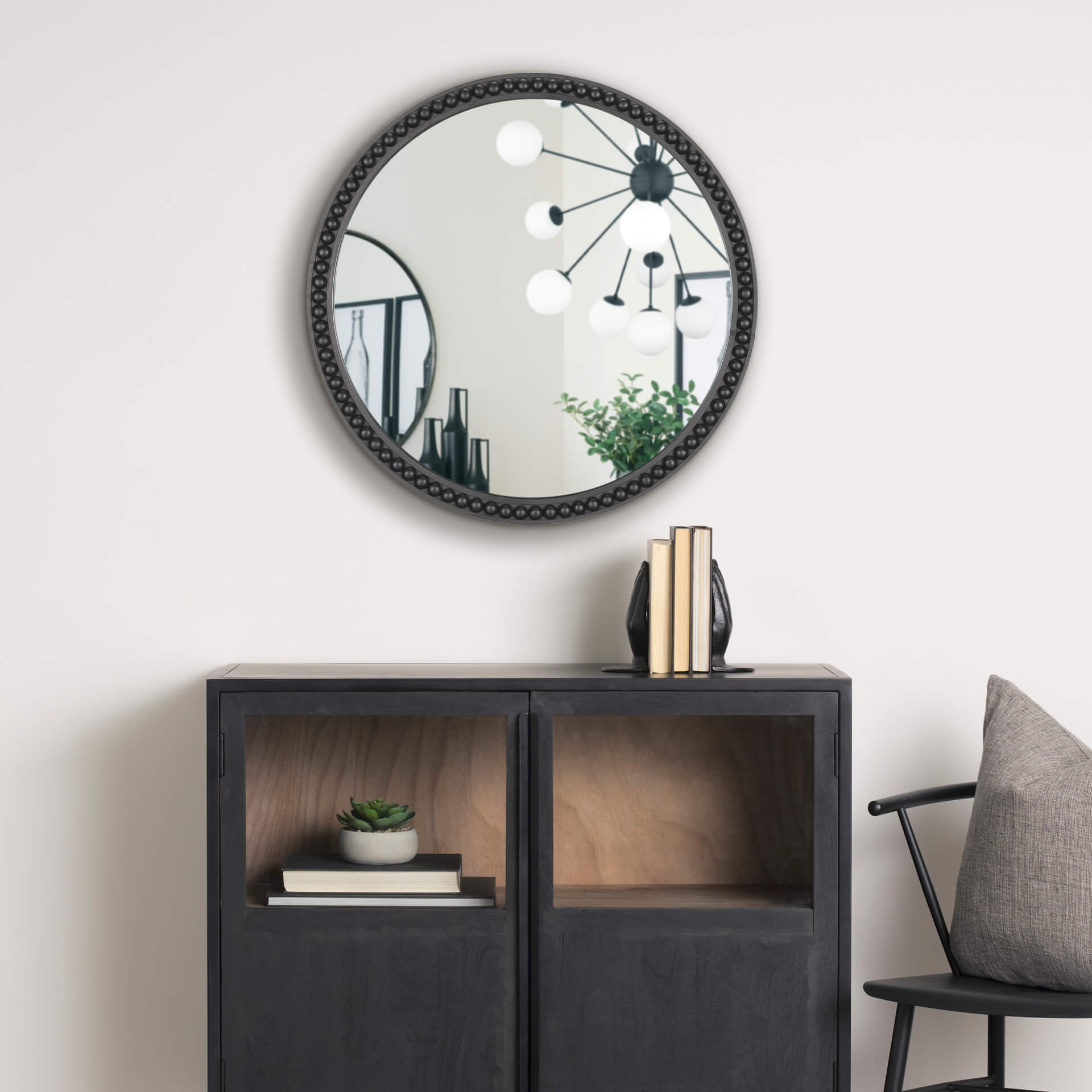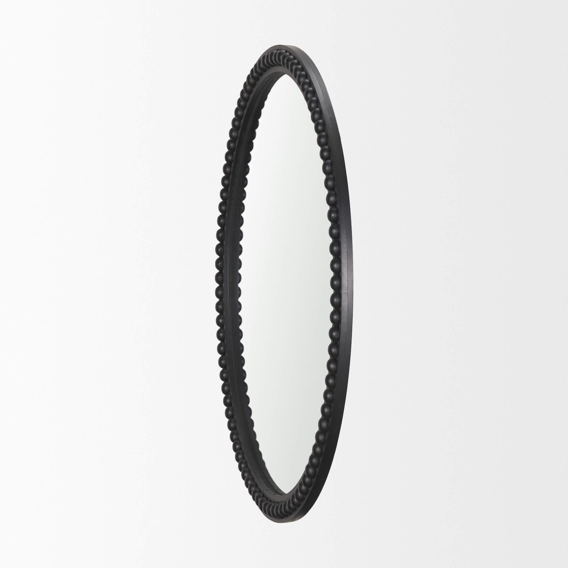 The Roan Mirror features a round, black wooden frame that has been gently white washed to accentuate the beaded detailing.