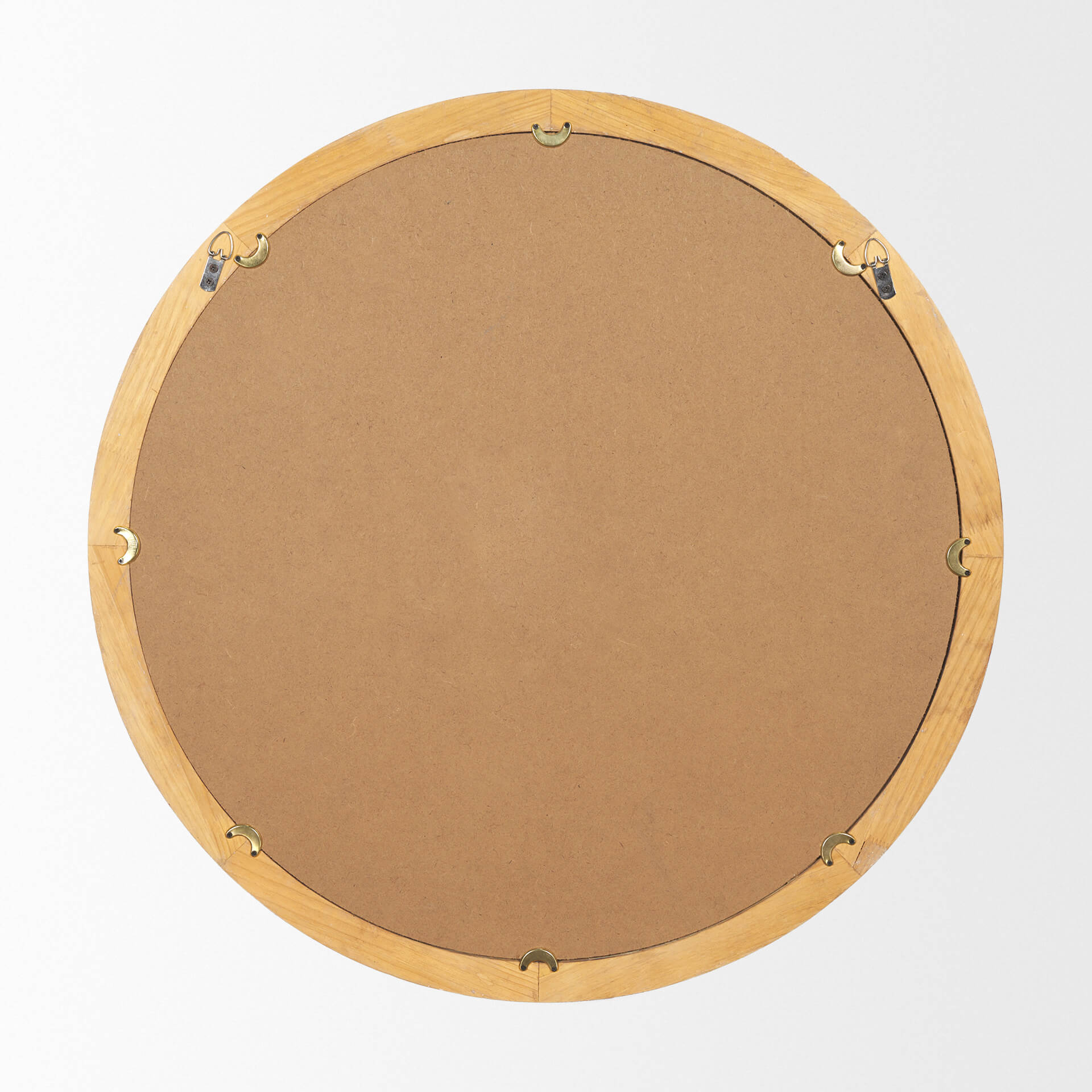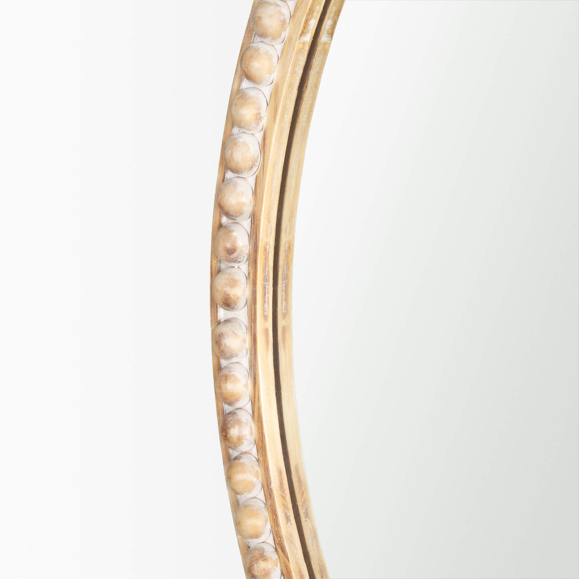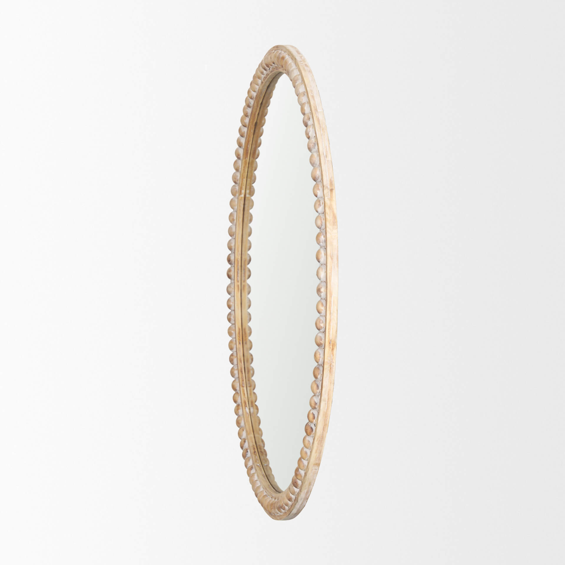 The Roan Mirror features a round, light brown wooden frame that has been gently white washed to accentuate the beaded detailing.