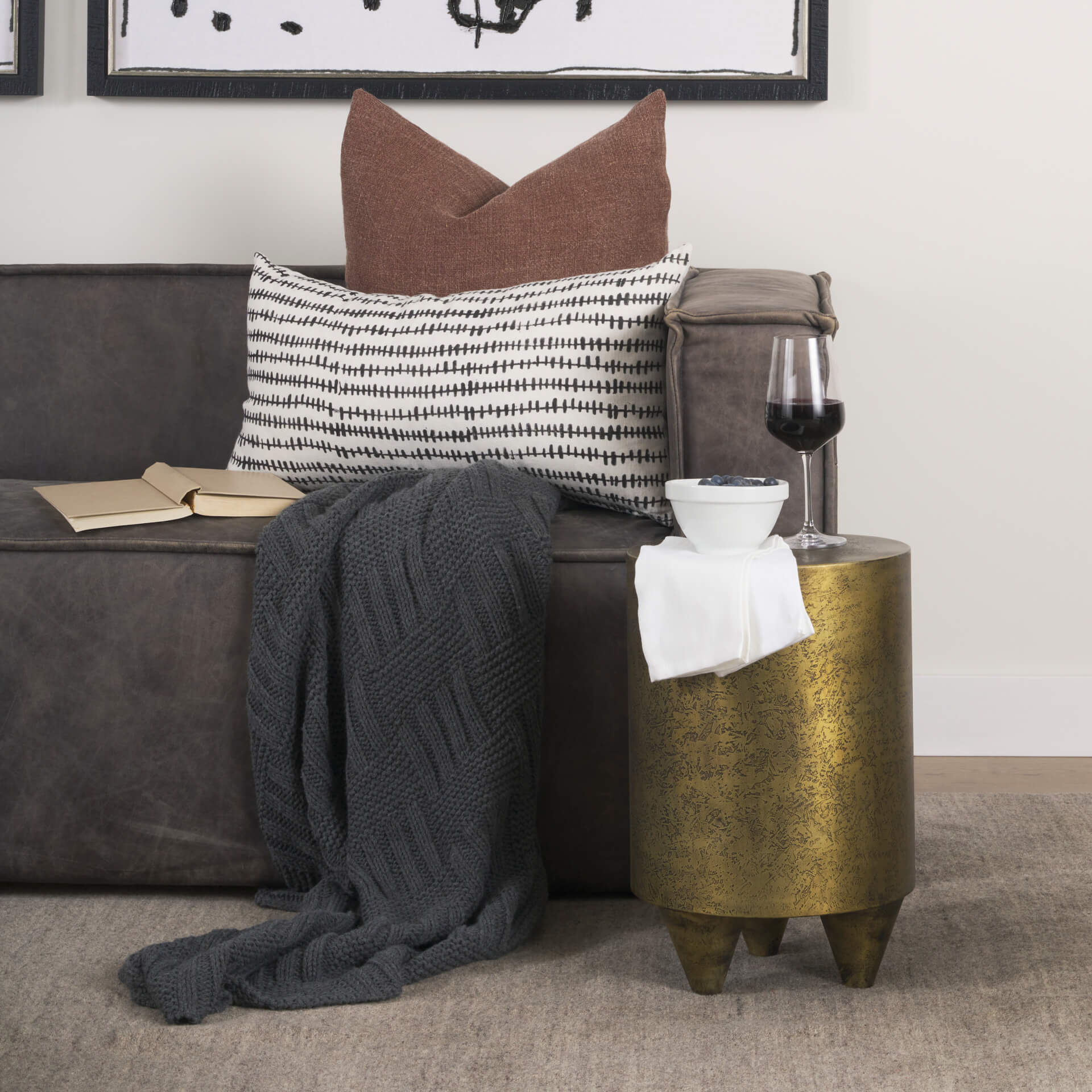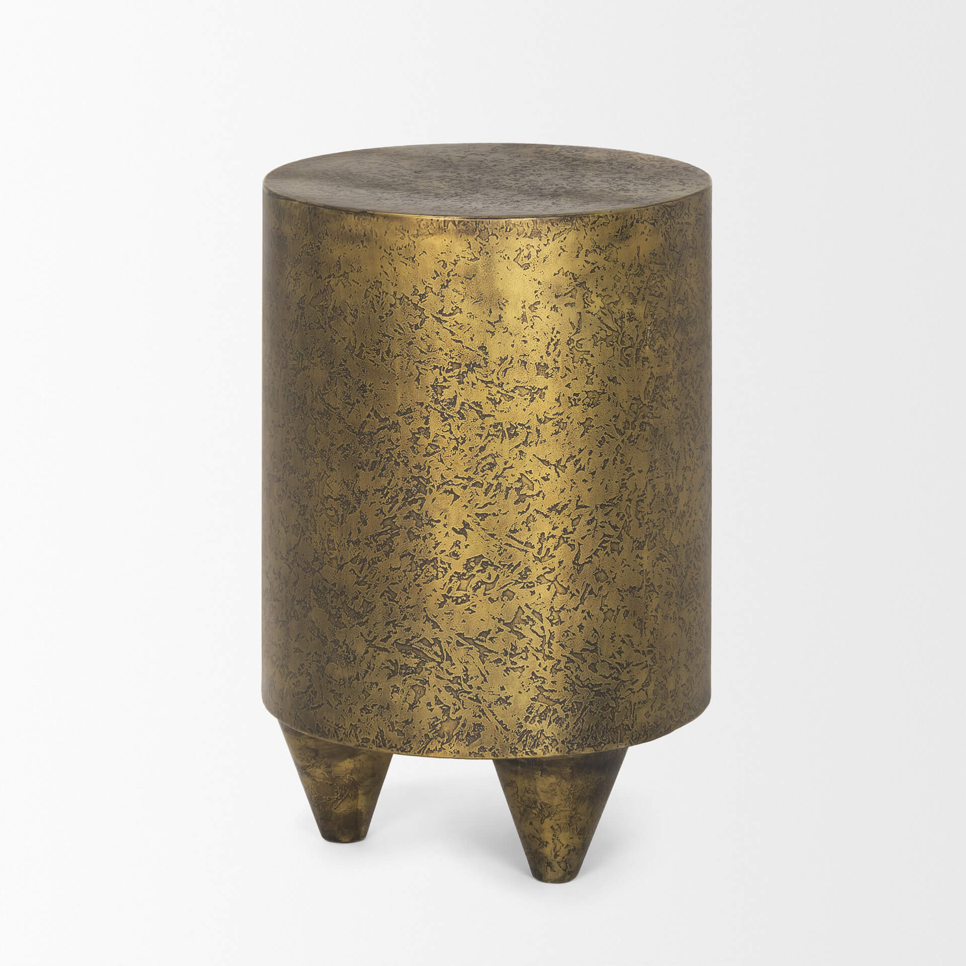 The Rosh Accent Table is a marriage of artful design and functional appeal with its sculptural body. The hollow but solid structure is crafted from lightweight textured cast aluminum and is uniquely finished with an electroplated antiqued-brass and finished with an acid wash treatment. This Accent Table is designed to add character and intrigue to interior spaces.