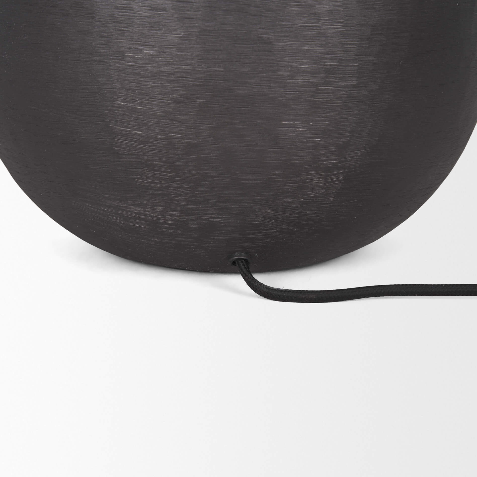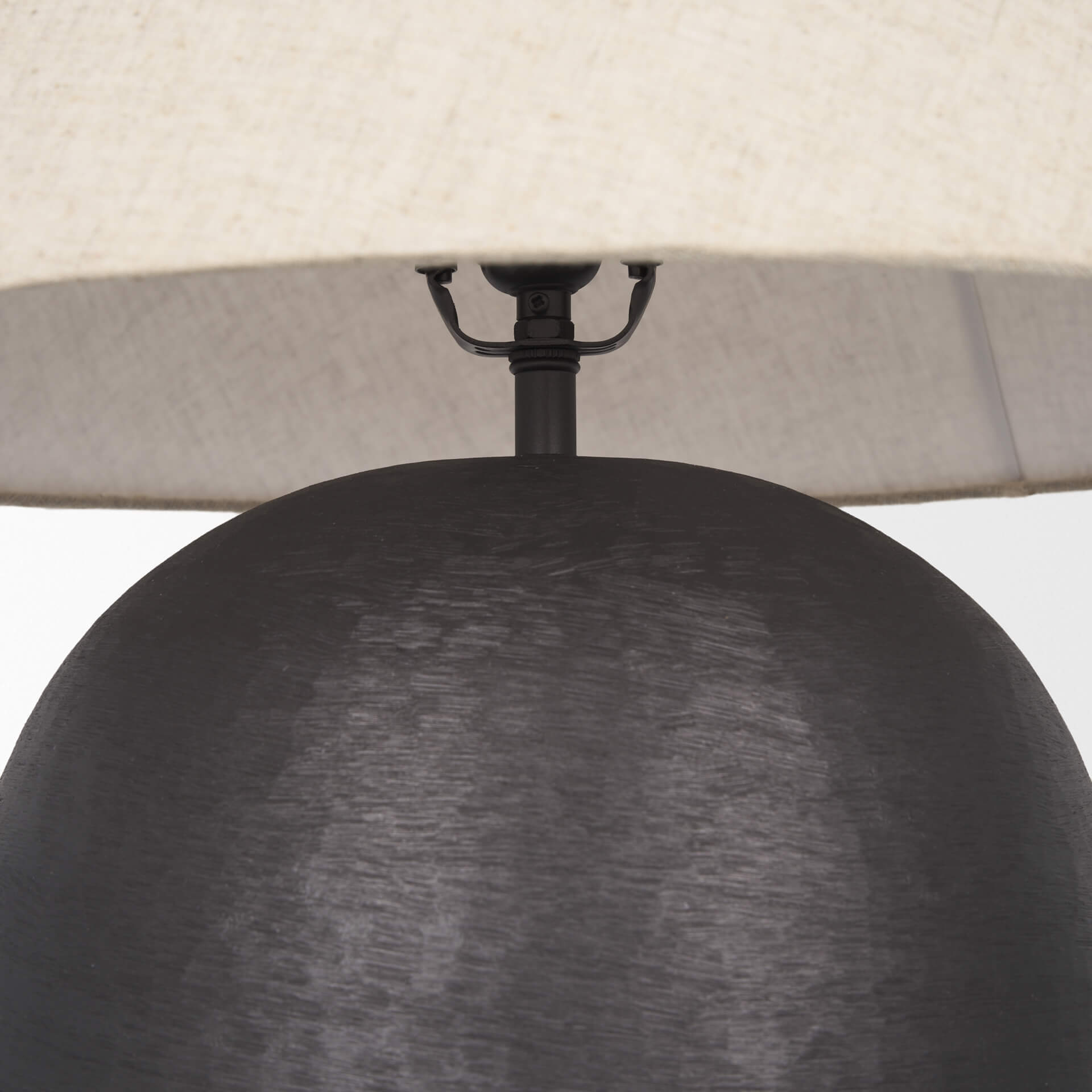 Sadiyah is a round table lamp boasting a charcoal-black finished metal body adorned with a unique brushstroke-like texture. The chic rusticity of the metal harmoniously contrasts with the softness of its beige shade, flecked with natural fibers. Effortlessly blending modern sophistication with organic elements, this lamp casts a warm and inviting ambiance, making it the perfect addition to elevate any space.