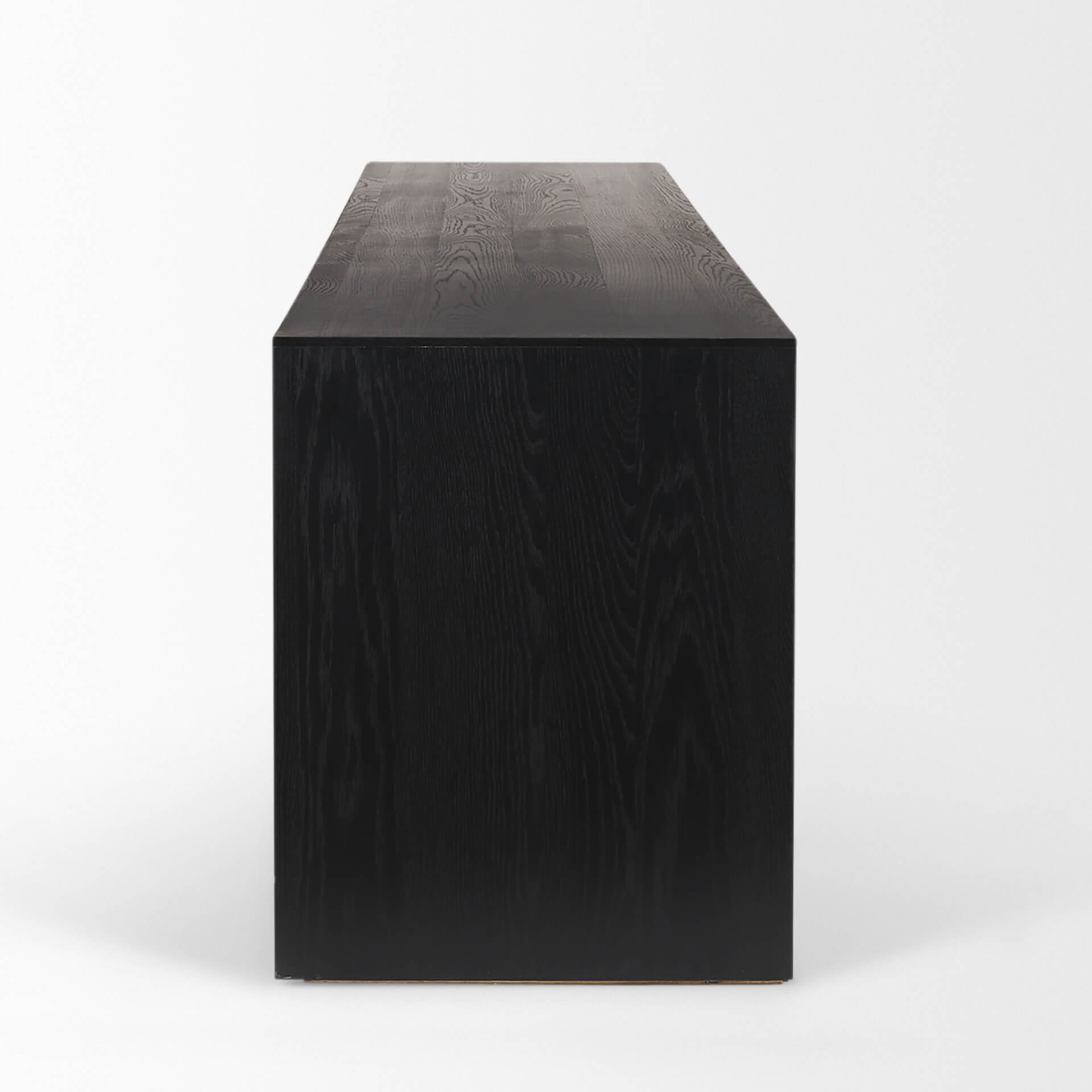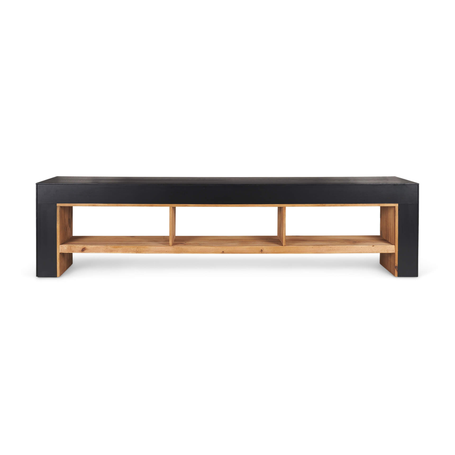 The Tabor Media Console is a stunning fusion of rustic allure and contemporary elegance. Crafted with authentic wormholes and natural distressing, the recycled pine exudes character and history. Contrasting against the clean lines of the modern black oak veneer tabletop, with an inward bevel edge seamlessly encased within a waterfall frame, this media console brings a bold statement to any space. With a solid structural aesthetic, rustic structure and contemporary sophistication, it's ready to elevate any space with its unique design.