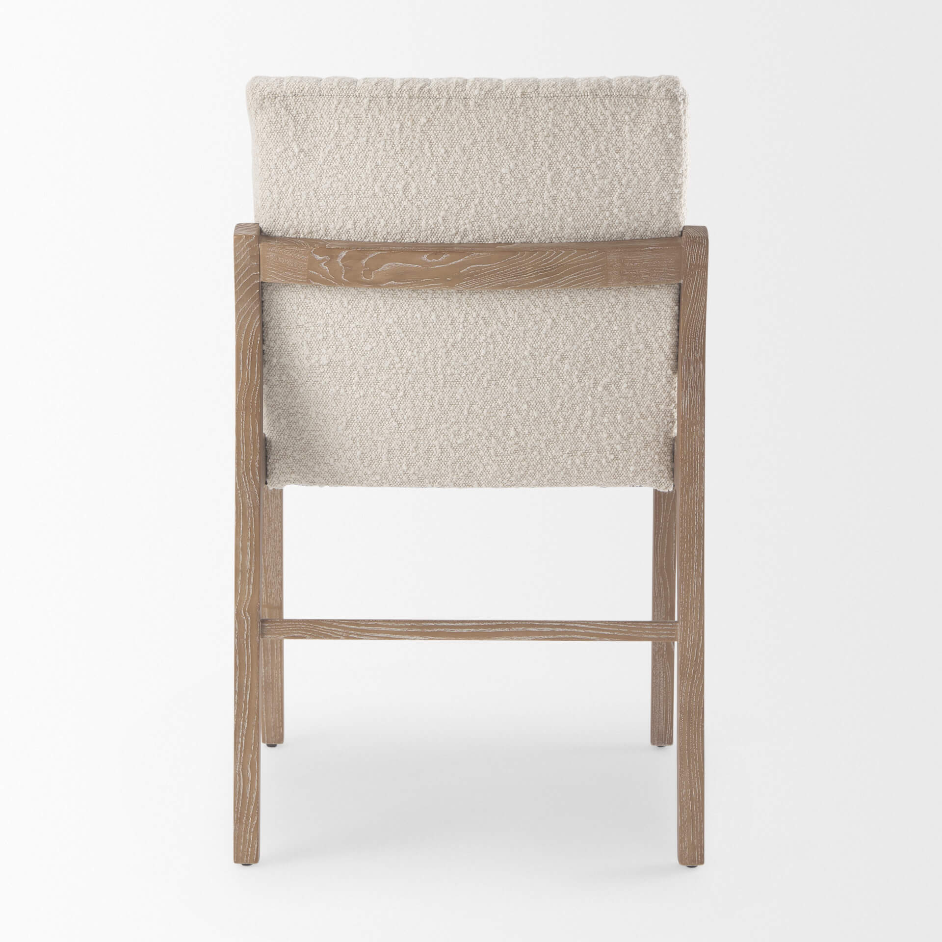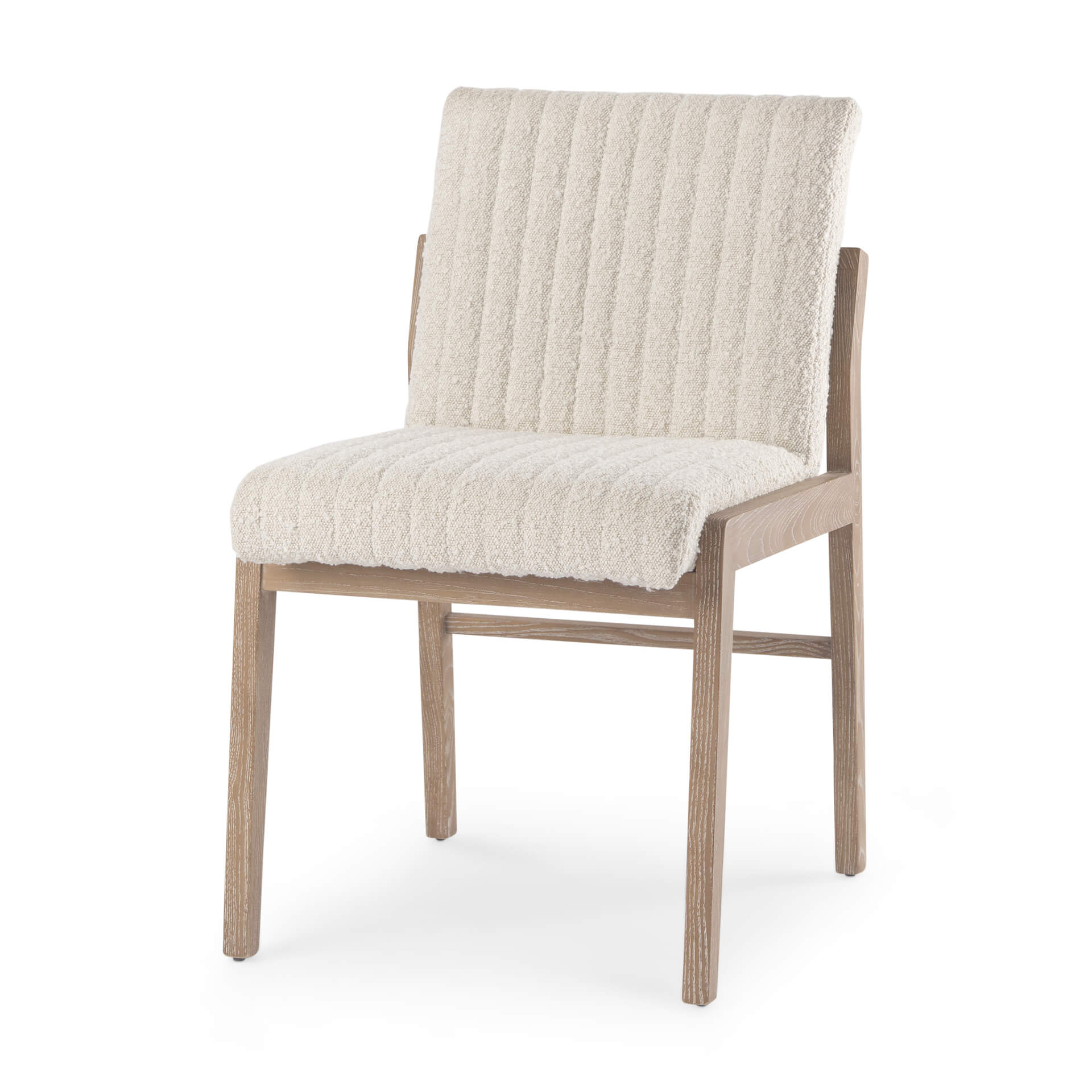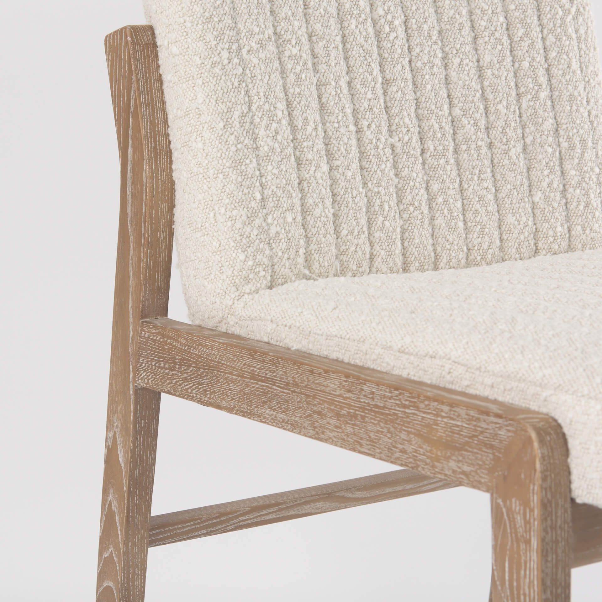 Undeniably, the creamy-white, textured bouclé fabric is the main attraction of the Tahoe Dining Chair. Its quilted comfort beckons to be sat on. But chance a look at the stylishly simple frame. Here, solid wood complements the quality of the fabric, and is further enhanced by a whitewash finish. The overall look will sit perfectly in a modern, coastal, or minimalist-themed home or office.