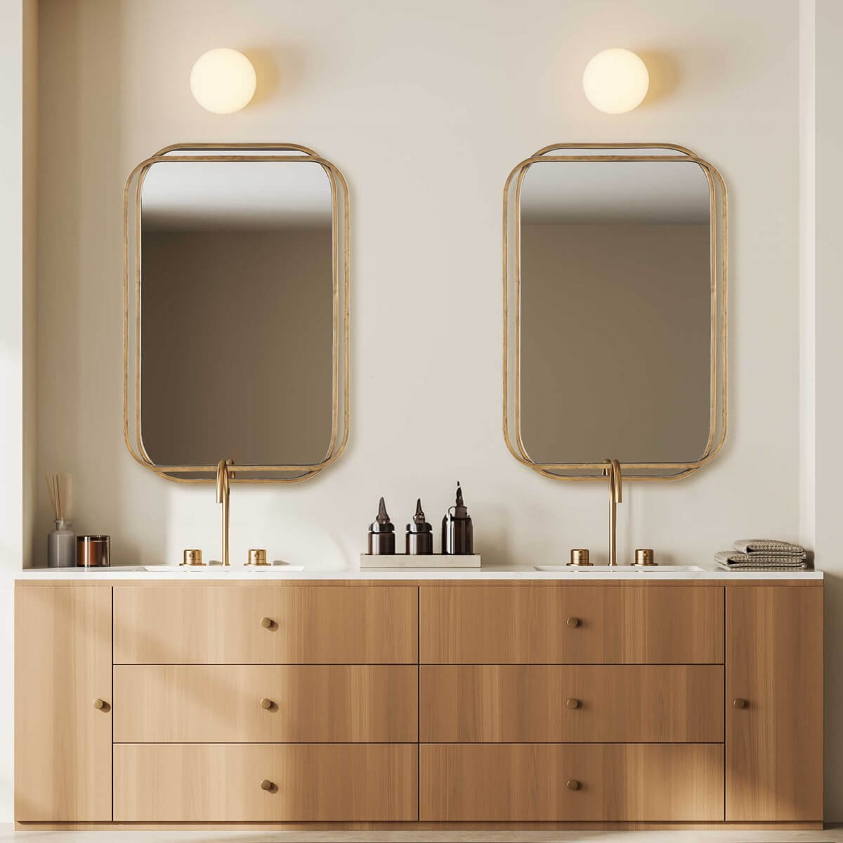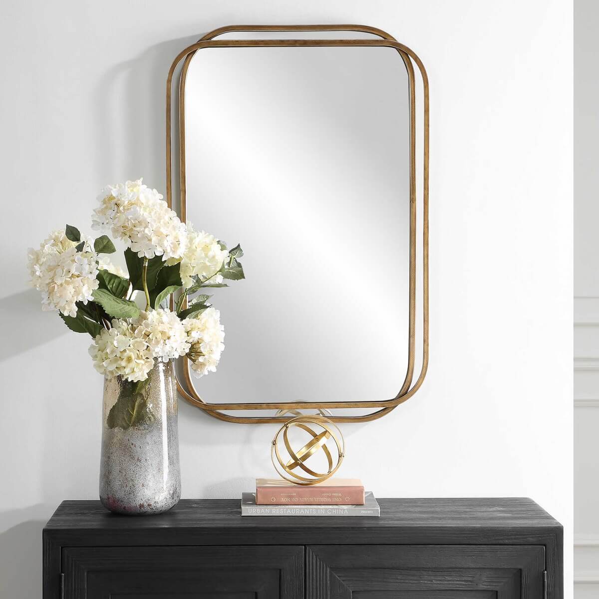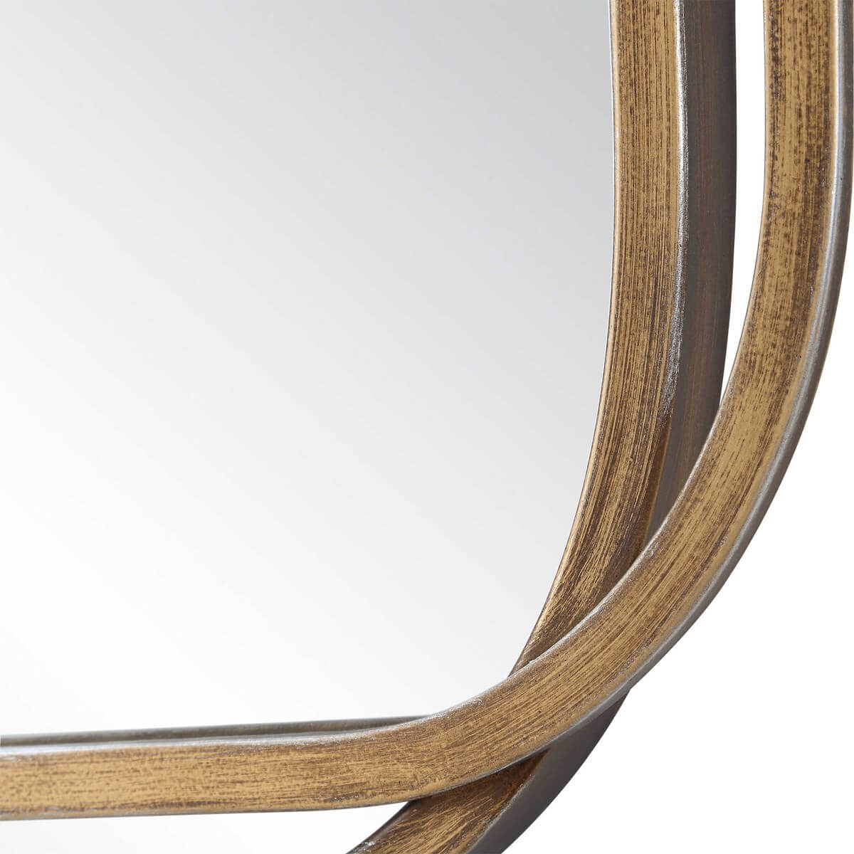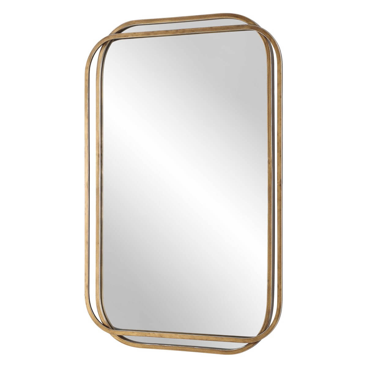 This contemporary style mirror features overlapping metal frames with radius corners. Finished in a brushed gold with subtle silver highlights along the frame edges, this mirror may be hung either vertically or horizontally.