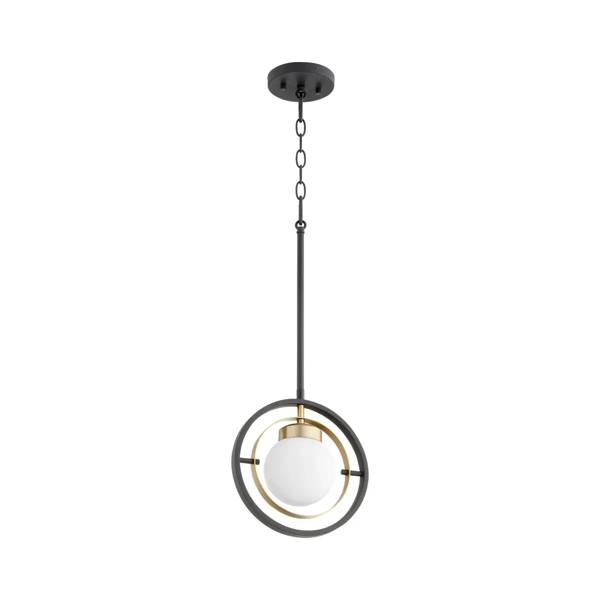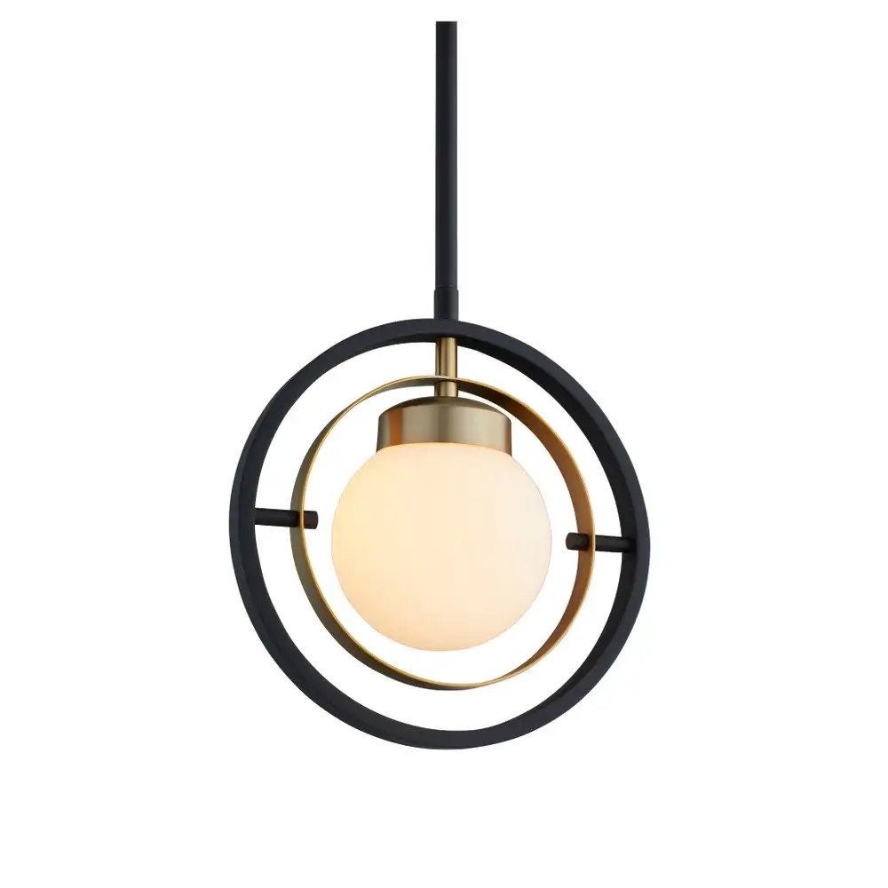 A unique and stylized luminary, the Nimbus pendant offers subtle sophistication with bold, clean lines. The fixture has a rounded black profile containing an aged brass circle that frames a globular satin opal shade. It’s the perfect lighting solution for any interior space.