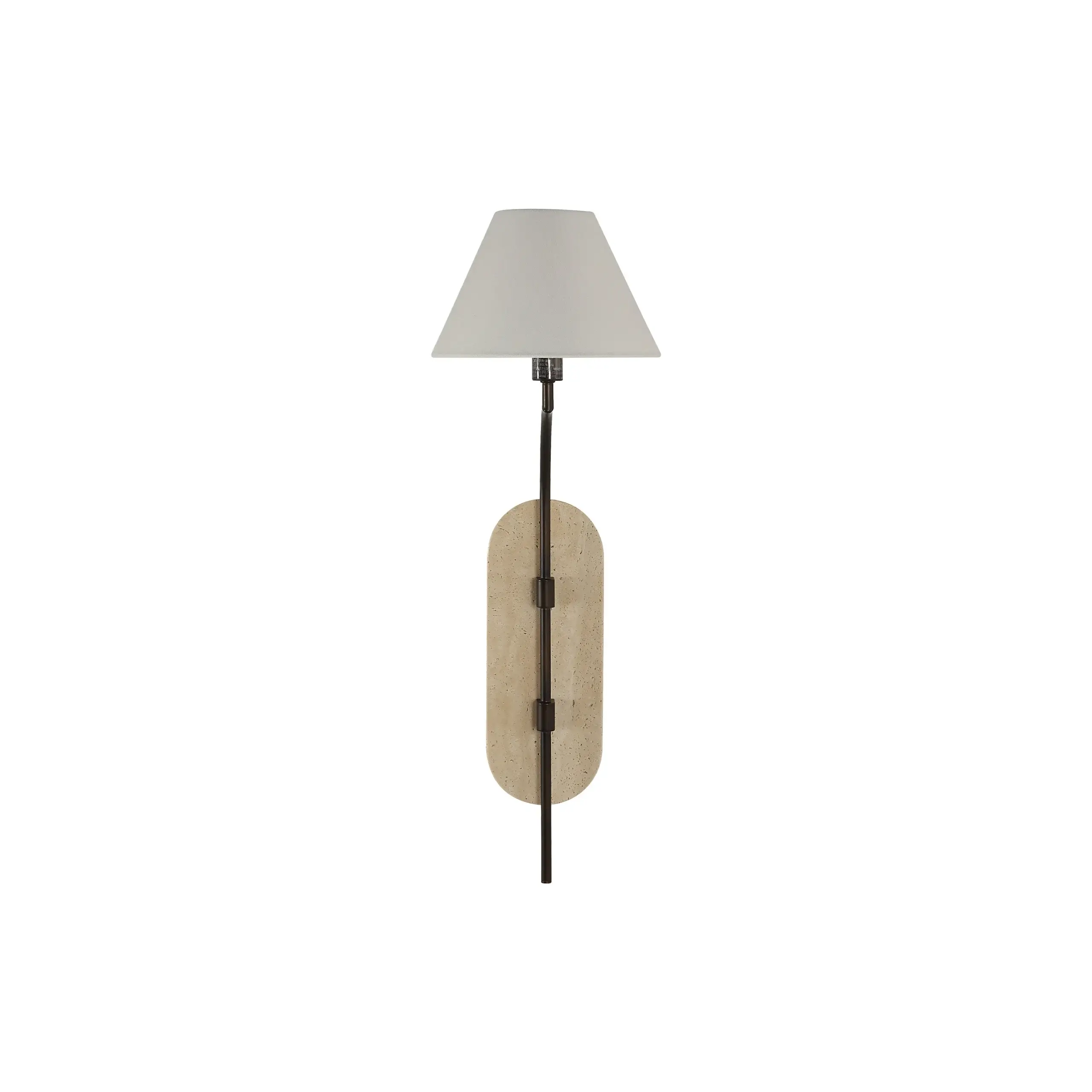 When it comes to layering lighting, it’s important to cover all your bases and that includes walls. Designed with a modern yet historic feel, this wall sconce is composed of artfully chosen materials including travertine and dark antique bronze-finished iron. Its ivory linen tapered drum shade delivers a classic touch and the perfect level of illumination.