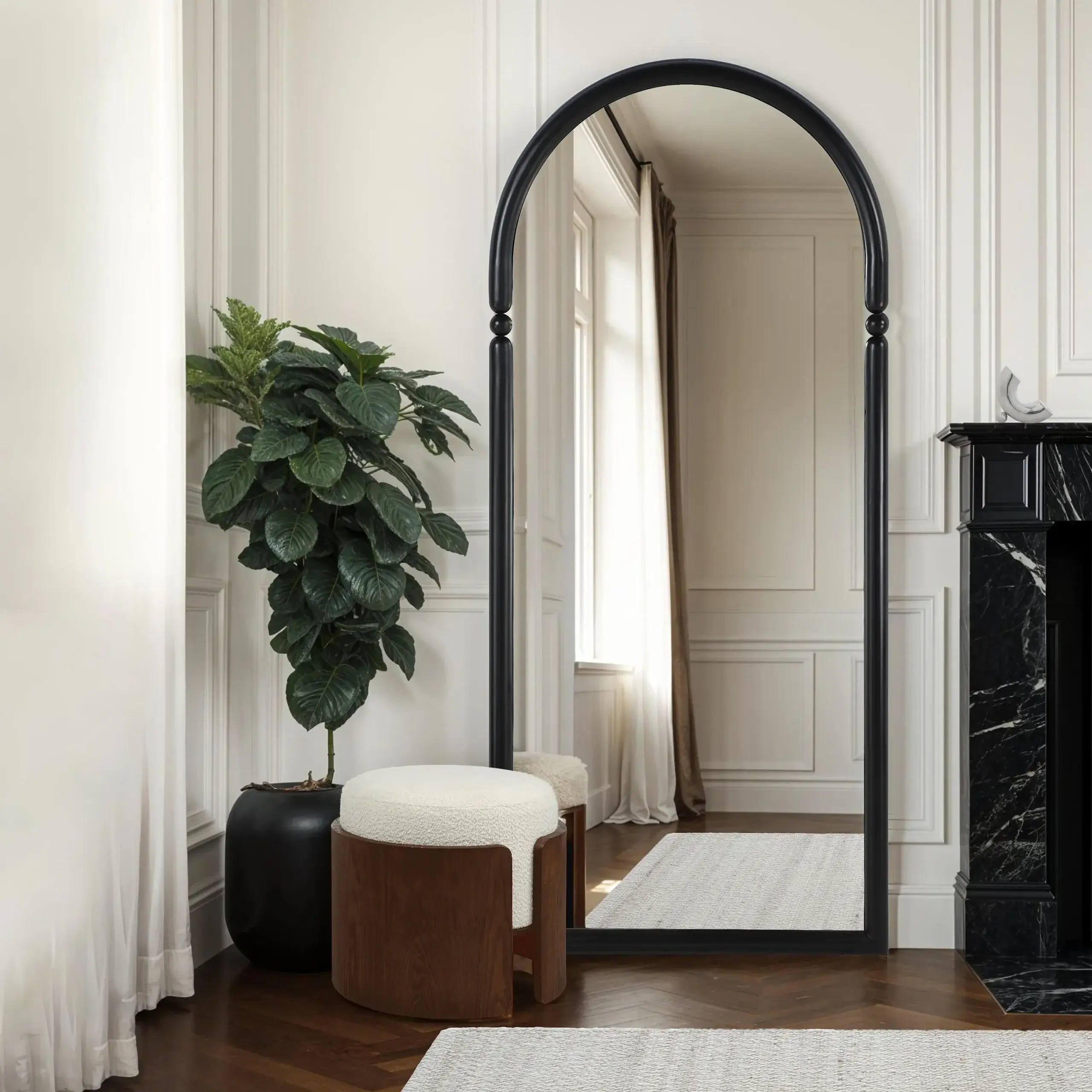 Featuring bead details on its matte black iron frame, Canadian television host, artist and designer, Steven Sabados brings us this stunning arch mirror that mixes old-world charm with a modern silhouette. Equipped with an anti-tip system and D-rings, you can choose to lean this large-scale full-length mirror against a wall or hang it. Either way, instant eye-catching appeal is guaranteed.