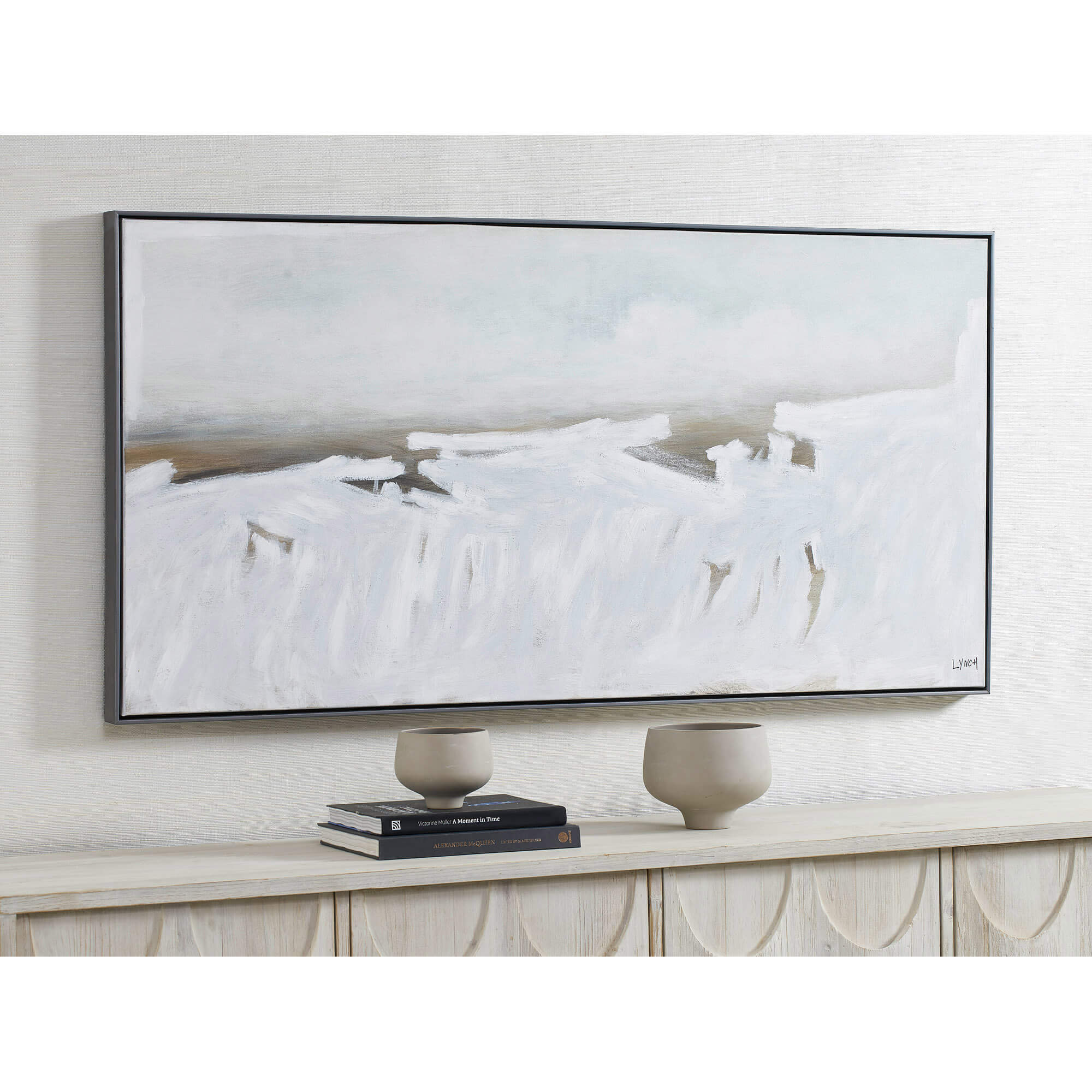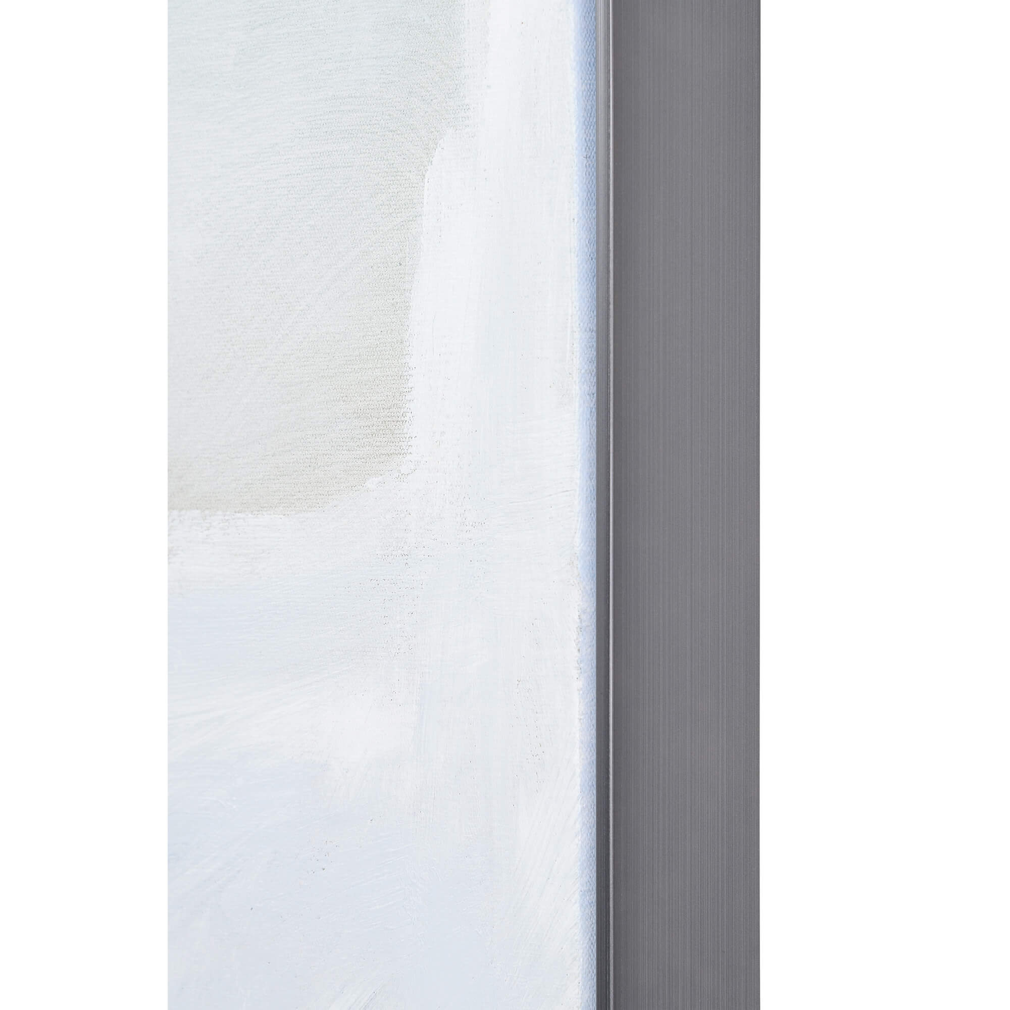 A textured finish heightens the feeling of the crashing waves captured within this piece. The pewter frame complements the minimal tones of the hand-painted piece without overpowering its design. The contemporary nature of this artwork fits well within a bedroom, hallway or living room space.
