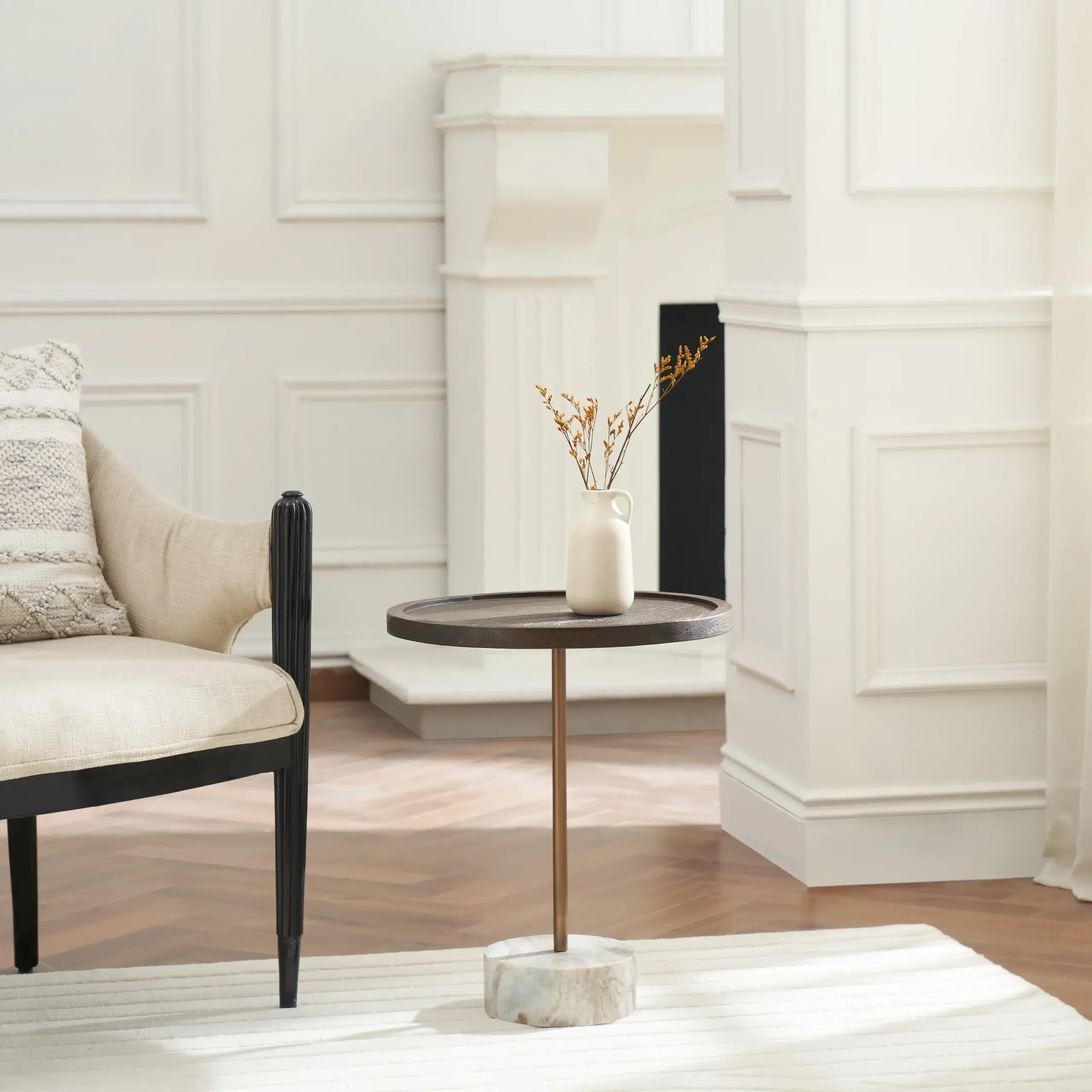 Measuring 18 inches wide, this accent table is an ideal size for placement next to a couch, chaise longue or bed. It features a natural marble and antique brass finished iron base for an airy feel and a mango wood tabletop with a walnut finish for a dark wood effect that’s totally on trend. Sleek and simple in its design, this end table would be a great complement to any design project.