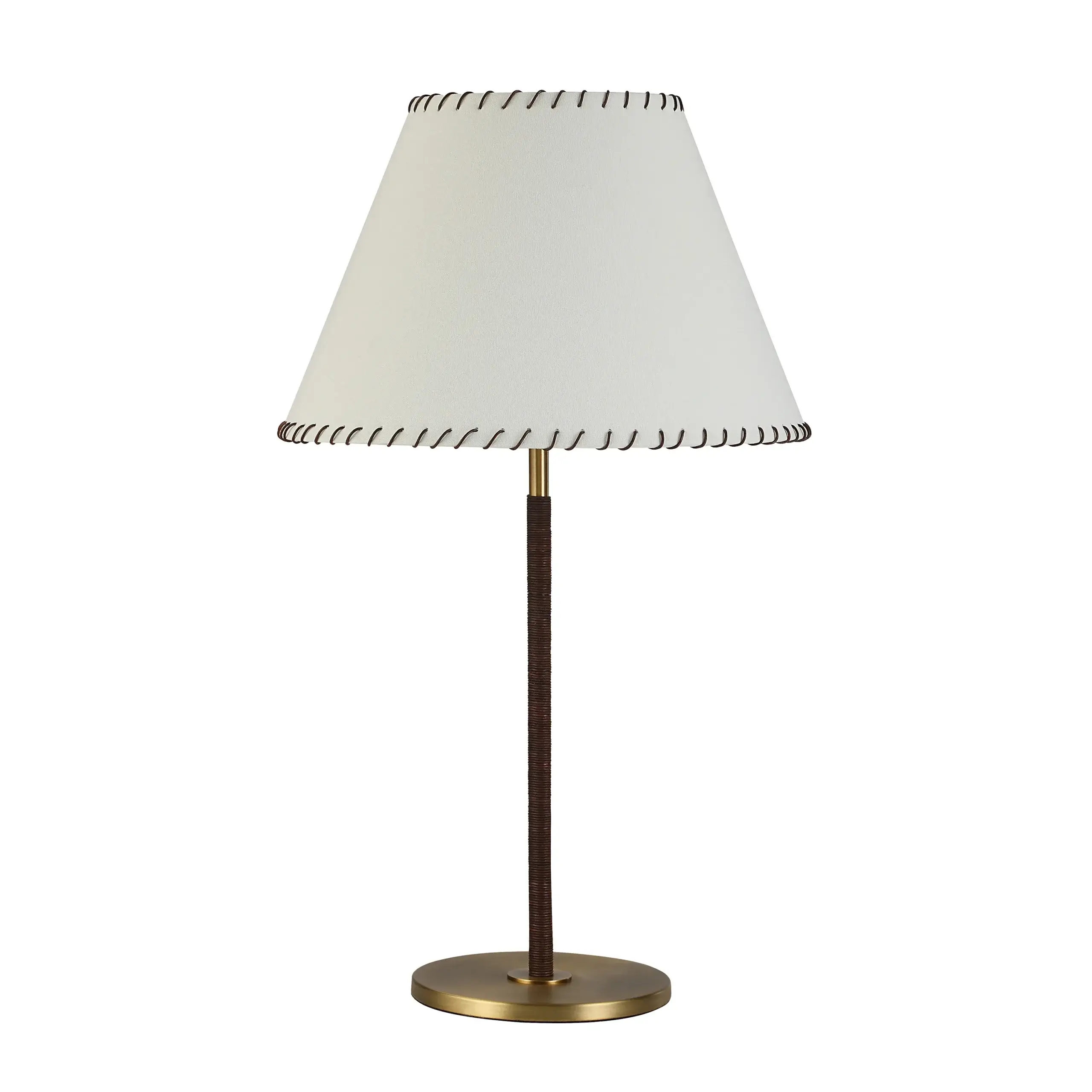 When you need a special accent for your design project, this transitional table lamp heeds the call. Wrapping up timeless finishes and unique details into one stunning piece, it features a dark antique brushed brass finish and an ivory linen shade with vegan leather stitching to create a hand-made look that gets noticed.