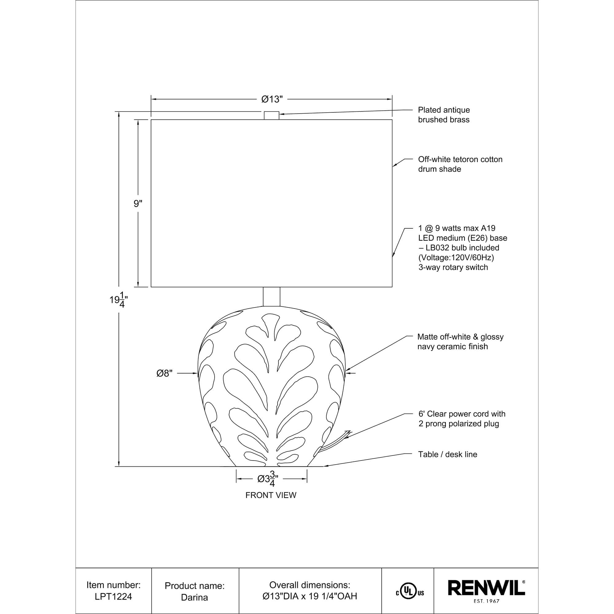 Dimensions : Dia-13″ X 19.3″H