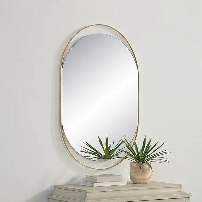 Transform any room with the elegant and stylish Ecru 40" Tall Pill Oval Mirror. Made with high-quality materials, this mirror boasts a sturdy construction that will last for years to come. The mirror features an oval shape, and the frame has a sleek satin brass finish that adds a touch of luxury and sophistication to any space. With its tall design, the mirror is perfect for any room in your home, providing a full-length view that makes it easy to get ready each day. Whether it's for your bedroom or living room, the Ecru Oval Mirror is the perfect addition to complete the look of any sophisticated space.